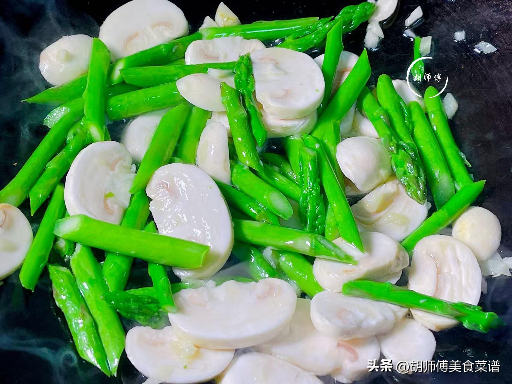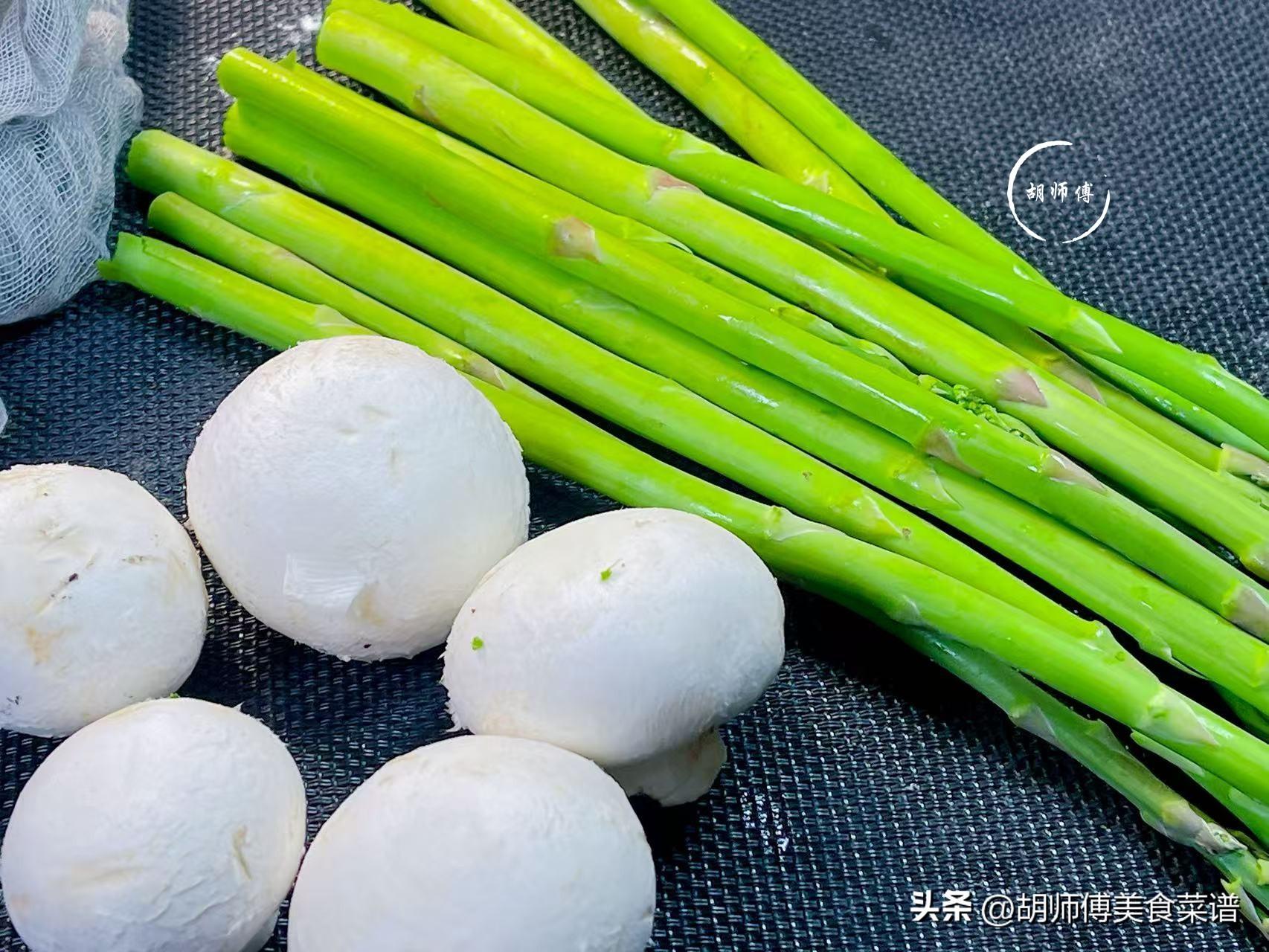 2、蘆筍和口蘑一定要放入鍋中炒一下,特別是用豬油炒,這樣可以更直接的激發出它們的香味,從而使這道菜喫着更鮮。