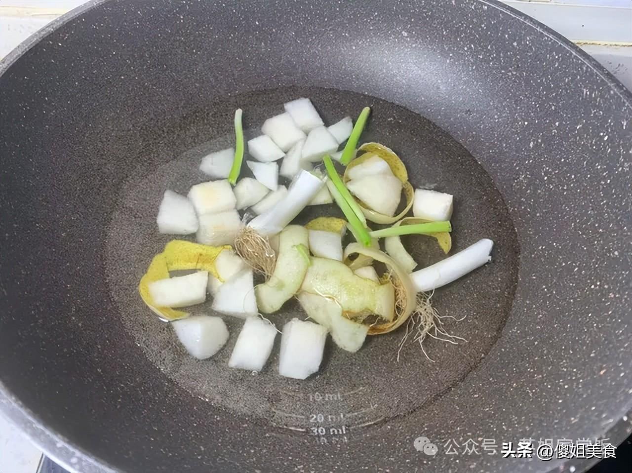 開大火把水燒開,等鍋裏的水冒起大泡後,轉成小火,蓋上鍋蓋,慢慢燉煮20-25分鐘。這時候不用着急,讓食材在鍋裏慢慢釋放味道,雪梨的清甜會一點點融進湯裏,小蔥的香氣也會慢慢飄出來,整個廚房都變得暖暖的。中途可以打開鍋蓋攪拌一下,防止雪梨粘在鍋底,如果加了冰糖,也可以趁這個時候放進去,攪拌至完全融化就好。