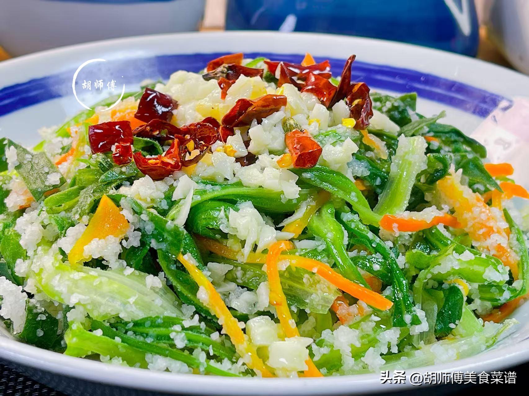 【食材準備】:麪條菜300克、胡蘿蔔50克、蒜末、幹辣椒、食鹽、大米粉50克、麪粉20克、雞精、食用油適量。