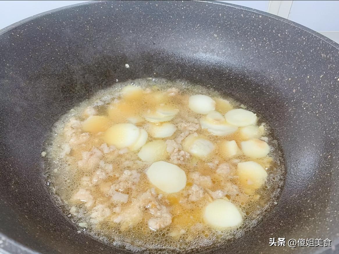 4. 調味燜煮:沿着鍋邊淋入一勺料酒,去腥增香。再加入適量的生抽,給芋頭染上一層漂亮的琥珀色。加一點點鹽和半勺糖提鮮,翻炒均勻後,倒入沒過食材一半的熱水。蓋上鍋蓋,轉小火燜個七八分鐘,讓芋頭徹底變軟,吸飽湯汁的味道。