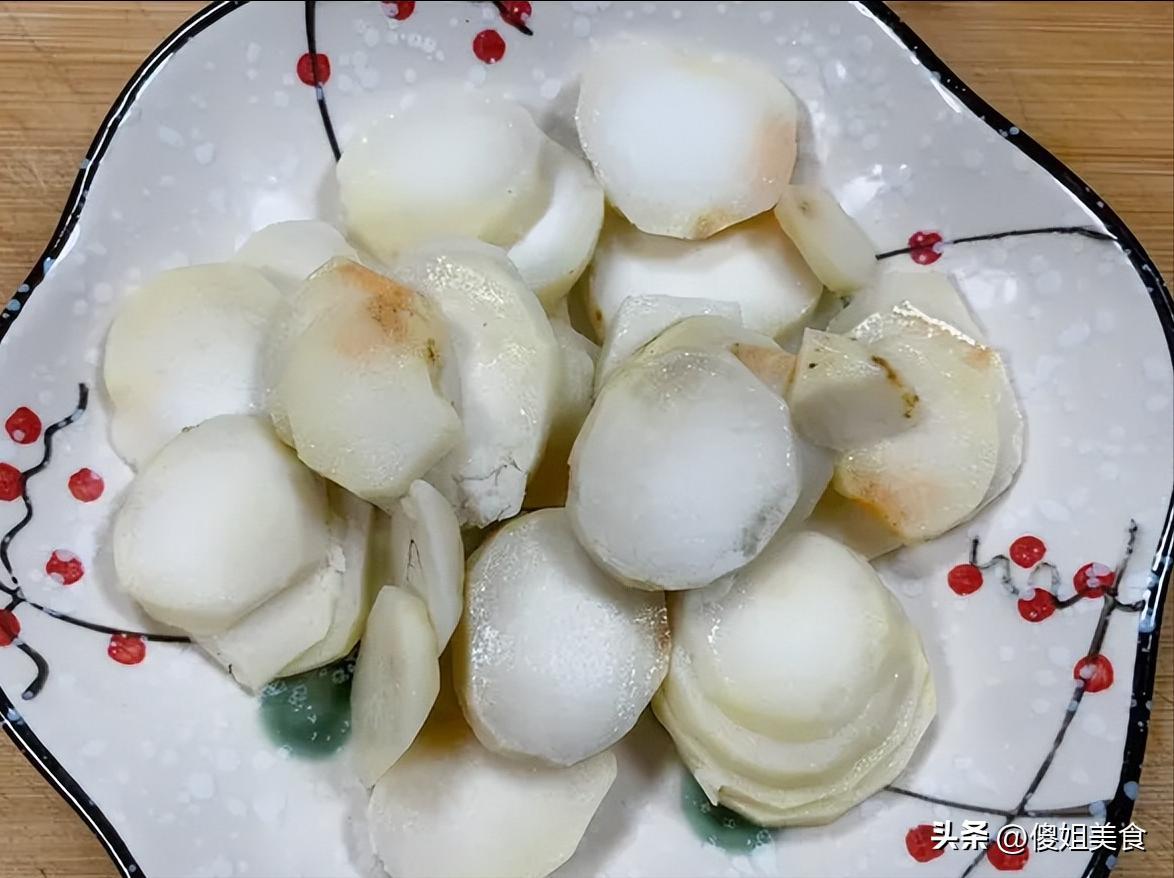 先把芋頭仔細洗乾淨,削去皮。剛削好的芋頭白白嫩嫩的,摸起來滑溜溜的,記得要趕緊泡在清水裏,不然它一會兒就會變“黑臉”,氧化發黑就不好看了。泡個十分鐘,撈出來切成厚厚的薄片,別切太薄,不然一炒就碎了。