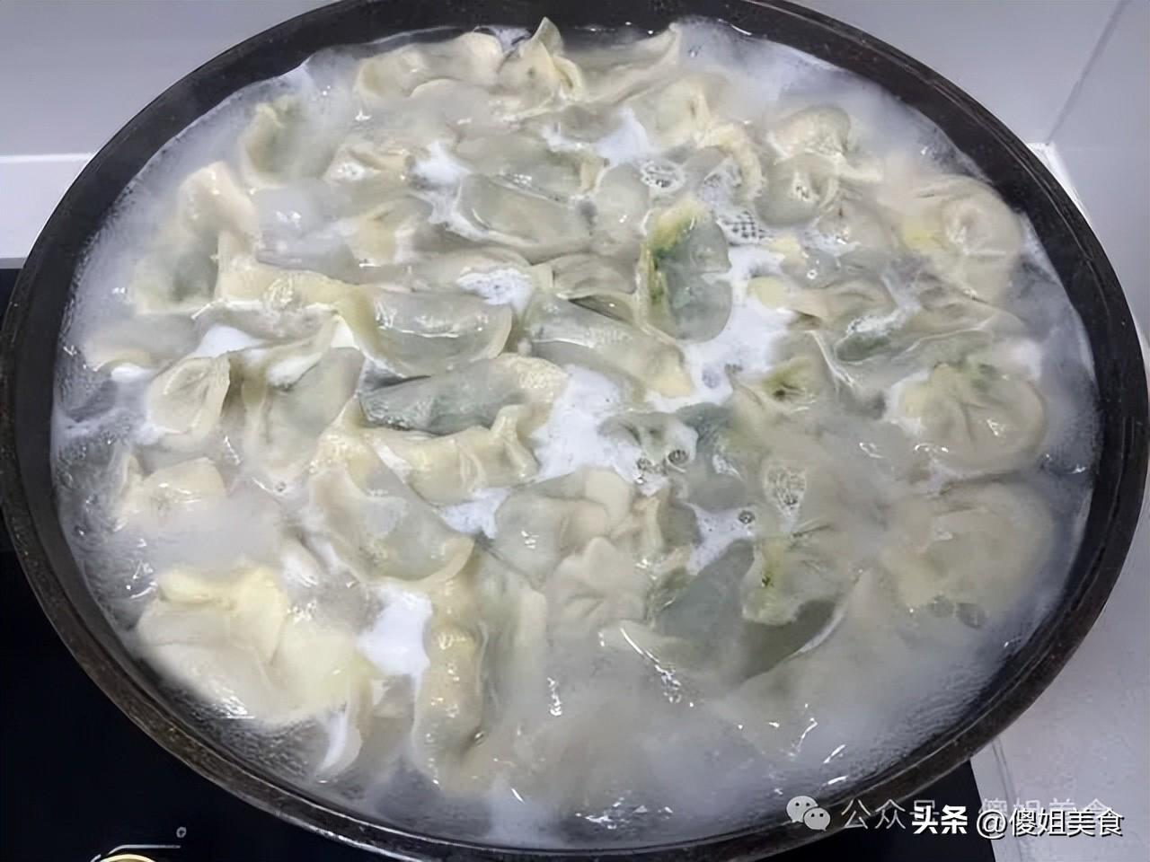 2. 水開後點一次涼水,再開再點,一共點三次,餃子都浮起來,肚子鼓鼓的,就熟了。