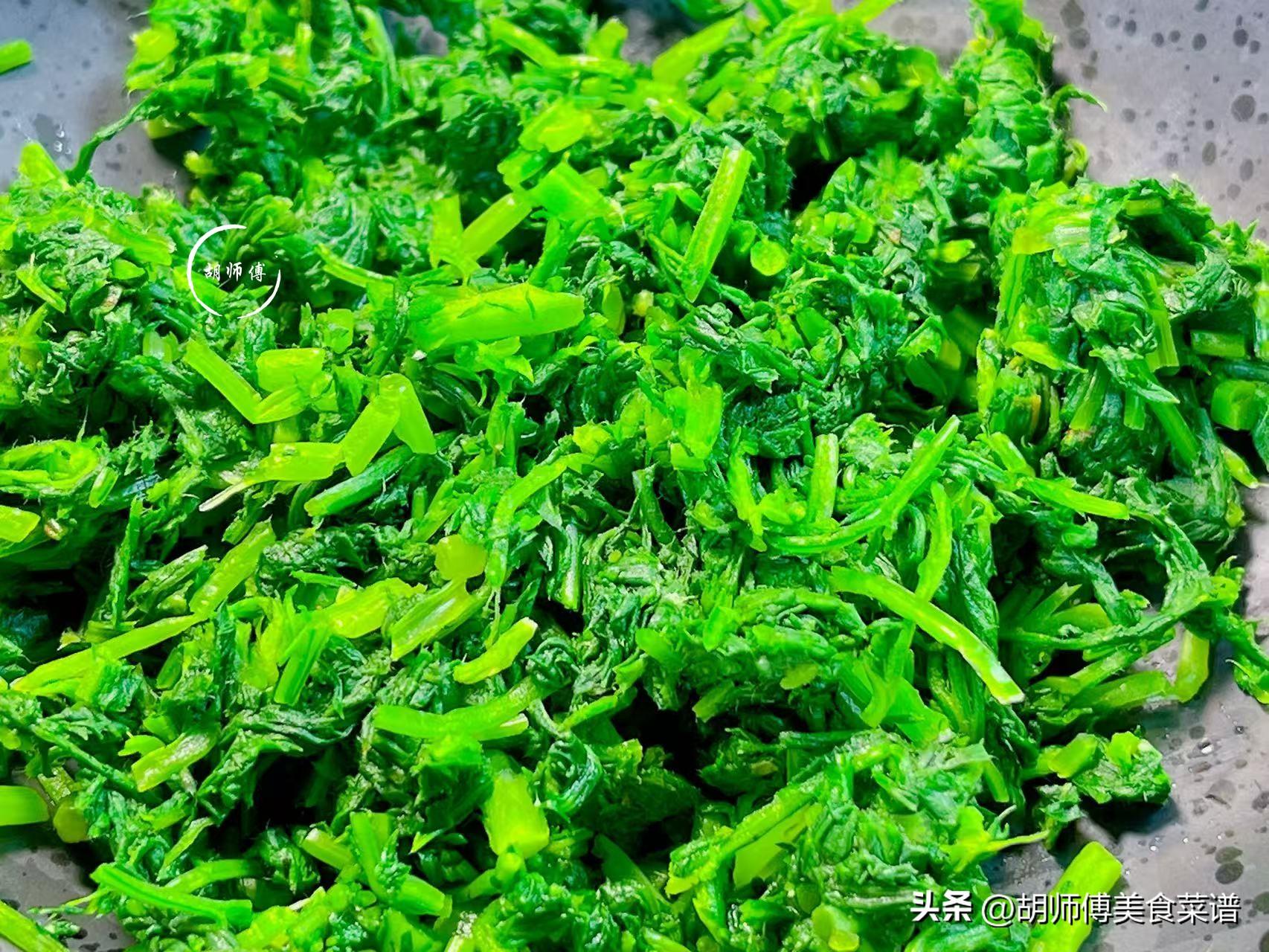 第二步:鍋中放入適量水,等水煮沸後,將艾草放入鍋中焯水30秒後撈出,然後將艾草過涼水,等艾草完全冷卻後撈出,接着再把艾草中的水擠出來,最後將艾草切成小碎末備用。