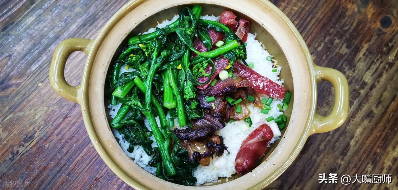 材料:大米300克、臘肉80克、臘腸2根、菜心100克、生抽15毫升、香油5毫升。