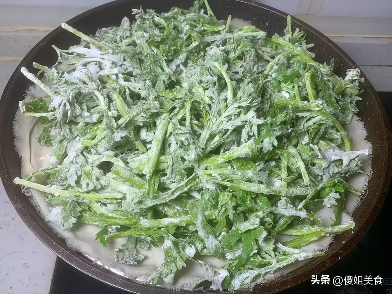 麪粉別放多了,多了會噎人,喫不出茼蒿的鮮味兒;放少了又粘不住,蒸的時候容易出水。咱就按茼蒿的量來,一把茼蒿大概放2-3勺麪粉就夠了,追求更健康的姐妹,也可以摻一半玉米麪,口感更粗糧更香~