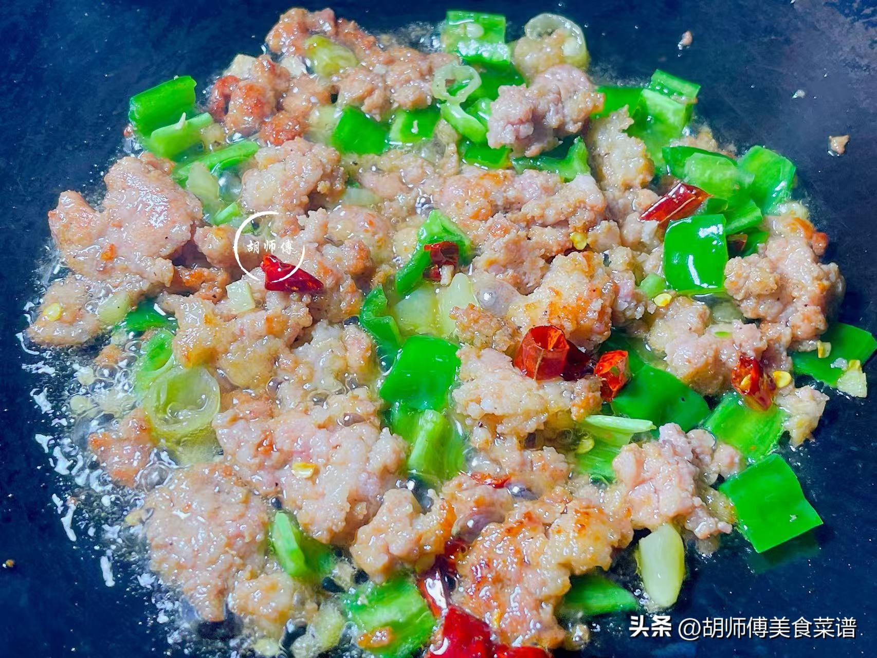 第五步:將鍋洗淨後燒熱,放入一勺油到鍋中,等油燒熱後,把肉末放入鍋中,將肉表面煸炒的有點發幹後,然後把蒜末、薑末、幹辣椒、泡椒都放入鍋中,大火將它炒七八下,徹底激發出這些調料的香味。