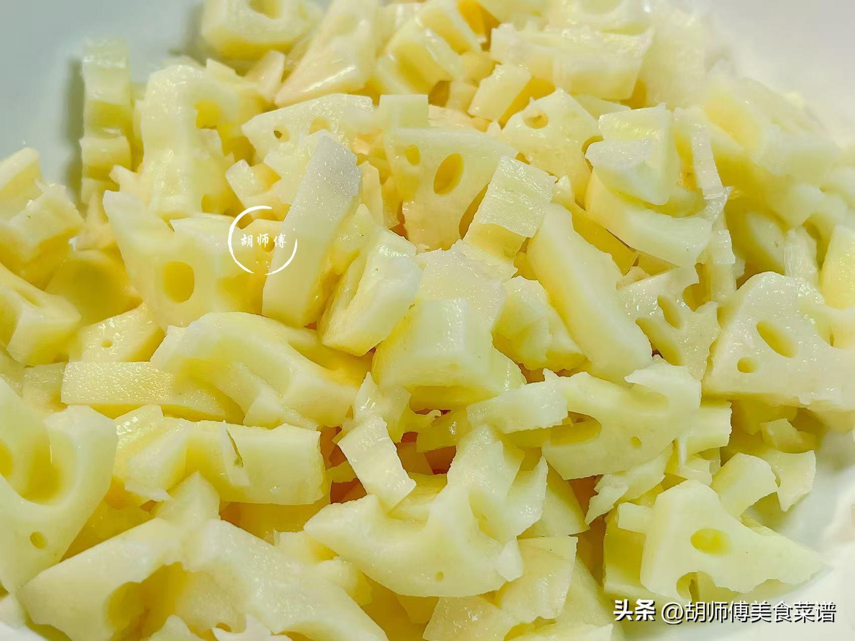 第一步:炒藕時,不要買特別大的,小藕喫着會更清甜。買回家的嫩藕,將它削皮後沖洗乾淨,然後把嫩藕切成下圖所示的丁狀,接着再用自來水將蓮藕表面的澱粉都沖走即可備用。