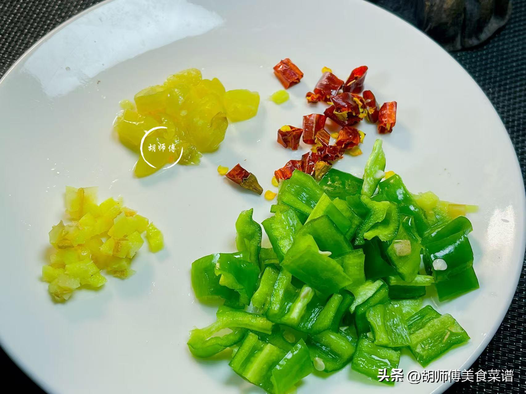 第三步:把青椒洗淨後切成小丁,然後把泡椒、幹辣椒都切成小段備用,接着再把生薑、大蒜籽都切成碎末備用。