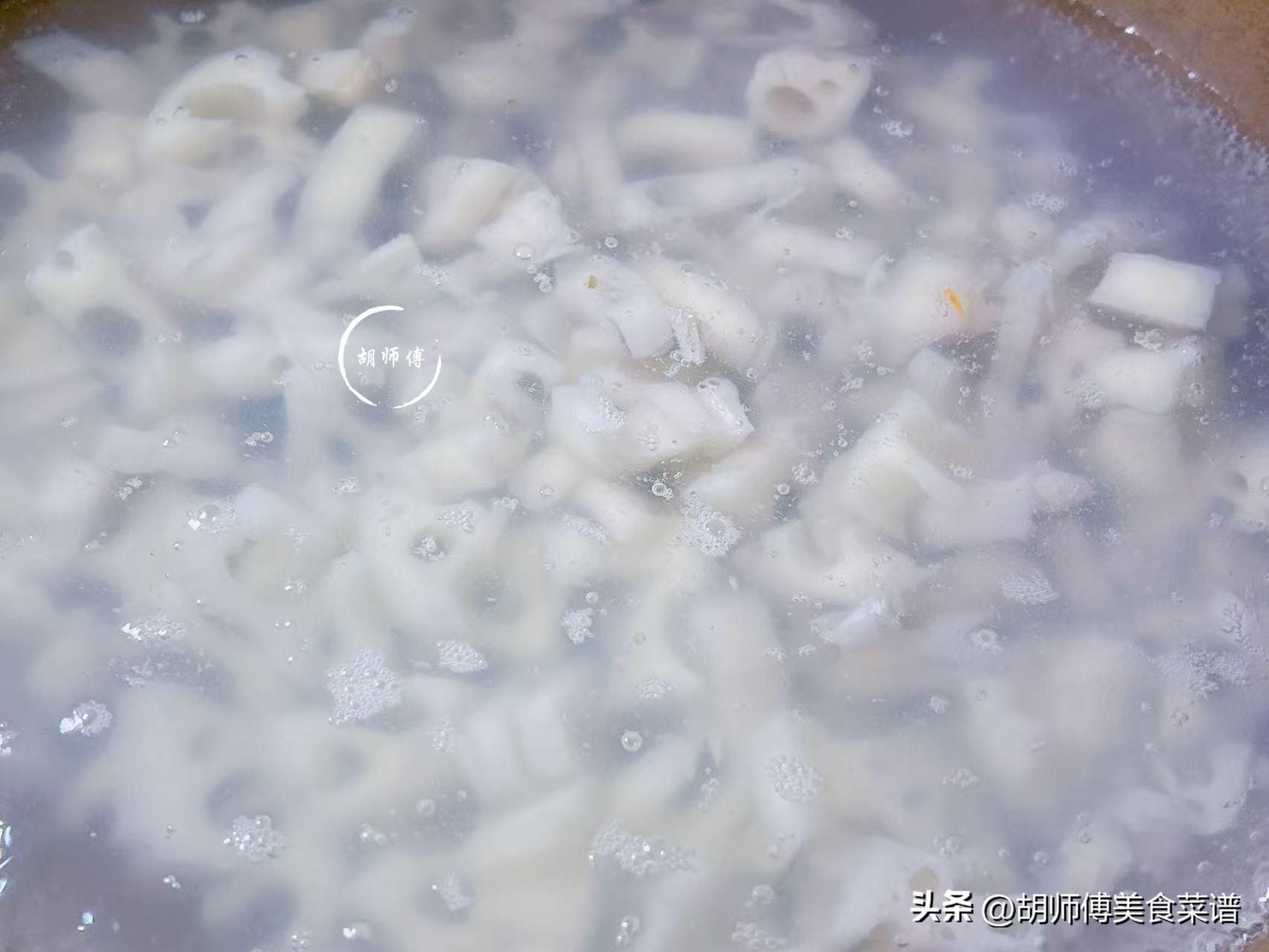 第四步:鍋中放入適量水,大火將水煮沸後,將藕丁放入鍋中,大火將蓮藕焯水40秒後撈出,然後再用自來水將藕丁沖洗乾淨。