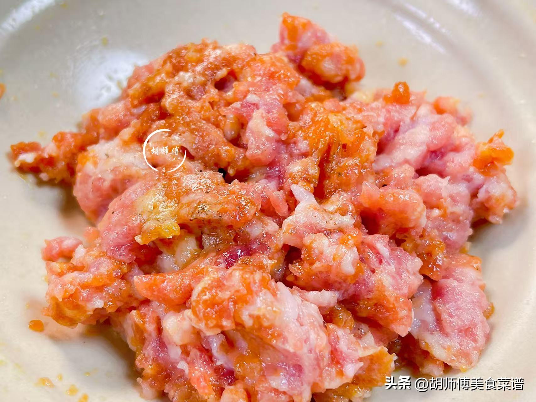 第二步:將前夾肉沖洗乾淨,然後把前夾肉去皮後剁成肉末,接着再將少許生抽、食鹽、澱粉、一點點水放入肉餡中,將它抓拌均勻即可備用。