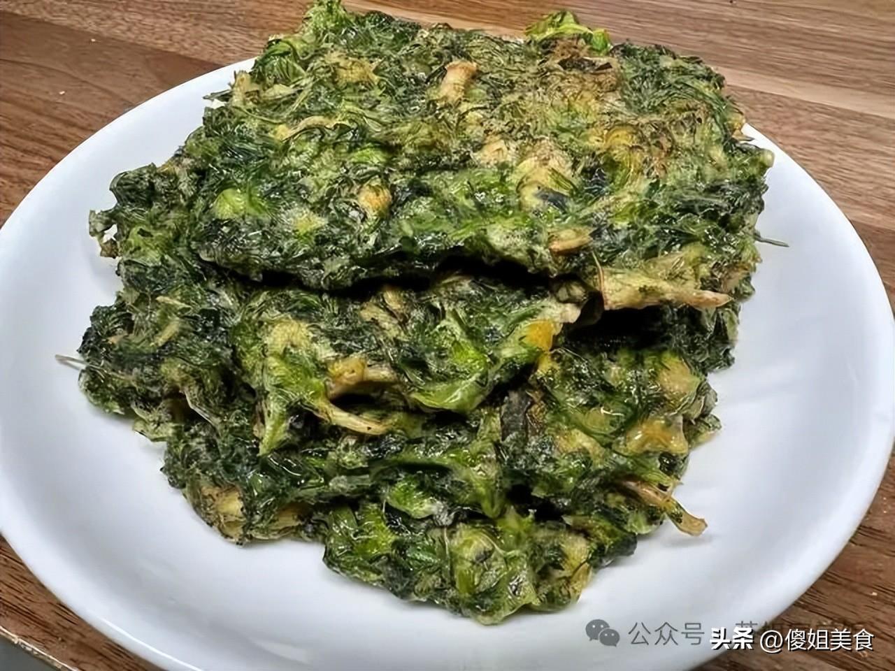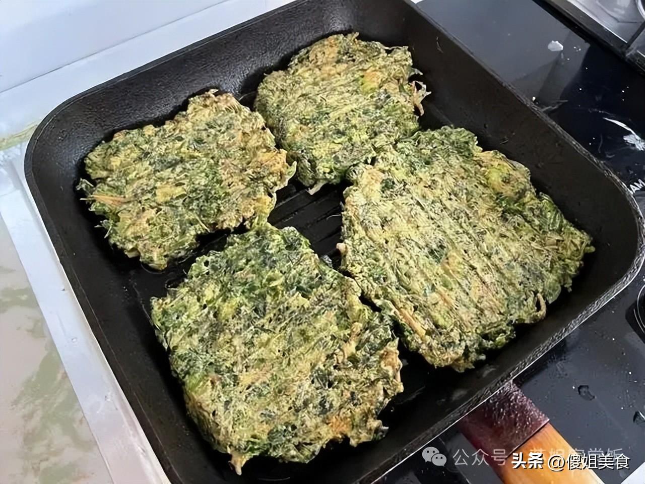 小竅門:焯水的時候加一點鹽和油,薺菜顏色會更翠綠;麪糊別太稀,攤得薄一點,喫起來外脆裏嫩,當早餐或零食都超合適!