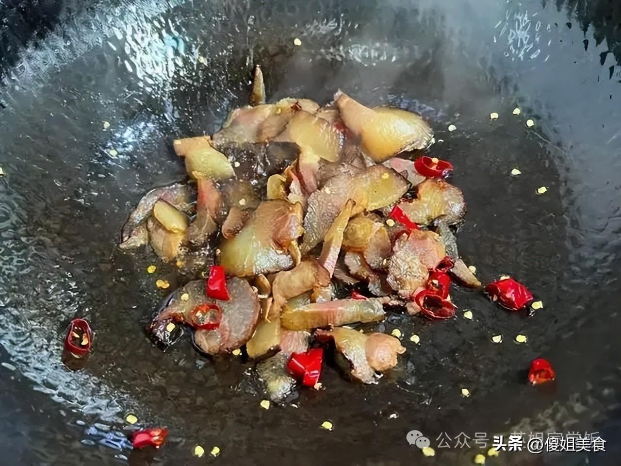 2. 鍋裏放少許油,放入臘肉片小火煸炒,把臘肉裏的油脂煸出來,喫起來不膩。