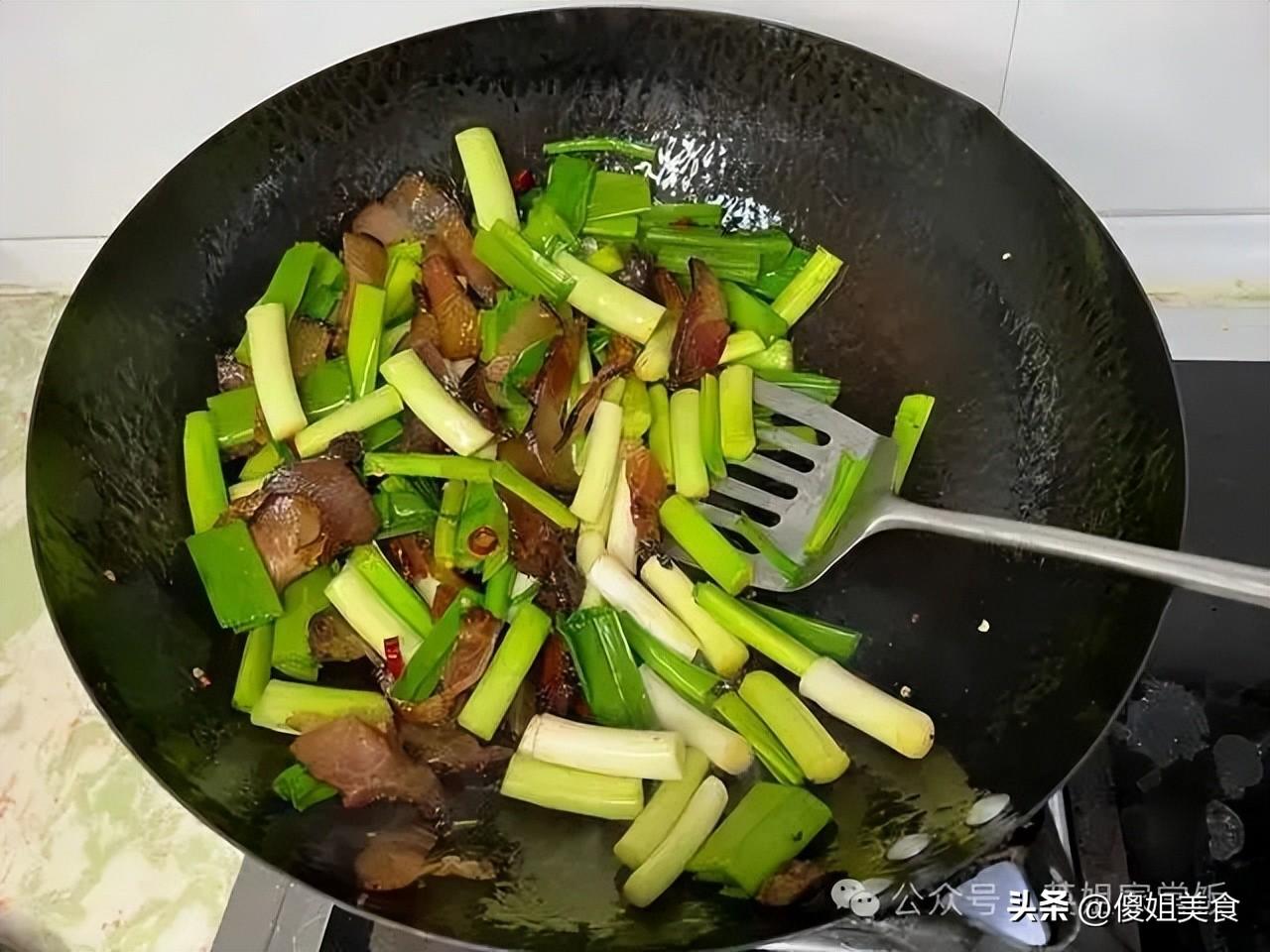 小竅門:臘肉一定要提前泡軟,不然太硬咬不動;蒜苗最後放,保持脆嫩口感,炒久了會發黃髮蔫。
