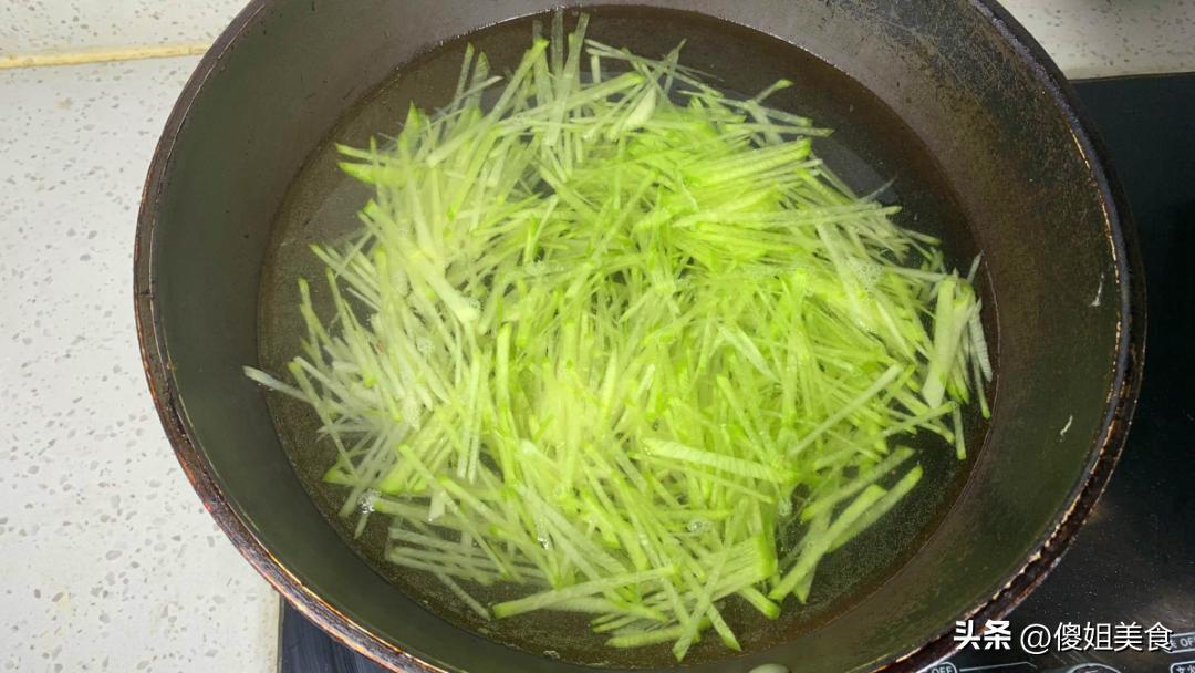 第二步:青蘿蔔洗乾淨,去頭去尾,用擦板擦成細絲。如果蘿蔔太大,擦出來的絲太長,可以用刀隨便切幾刀,別太長就行。