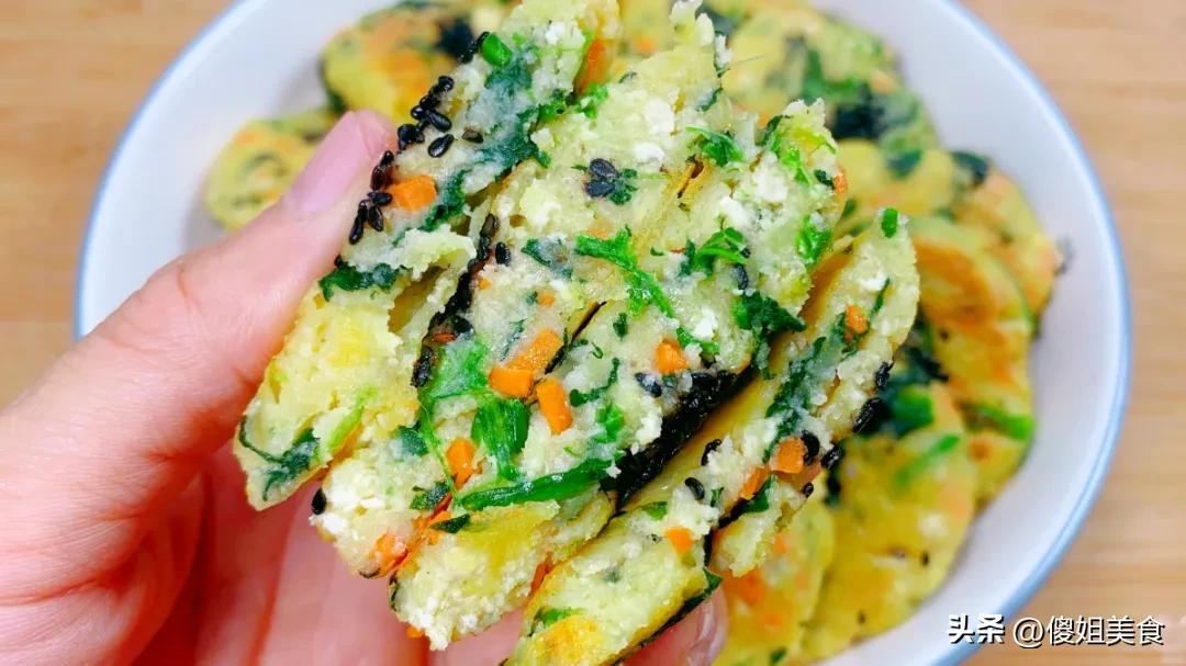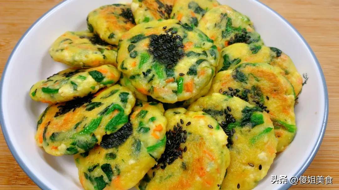 食材:菠菜一小把、胡蘿蔔半根、玉米麪50克、麪粉100克、雞蛋1個、黑芝麻一小把、鹽少許、食用油適量、清水少許