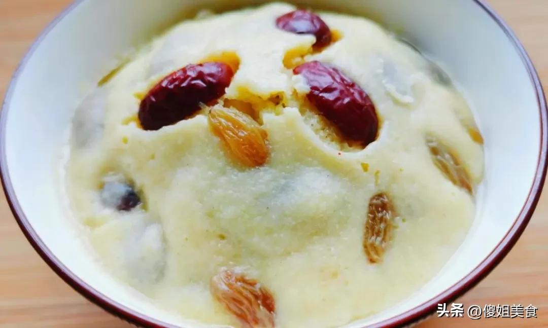 食材:小米麪200克、麪粉100克、酵母3克、白糖20克、溫水適量、紅棗幾顆、葡萄乾一小把、食用油少許