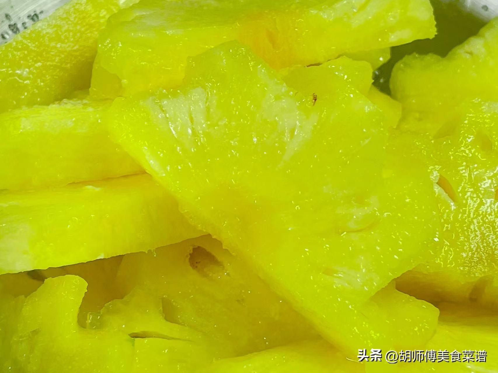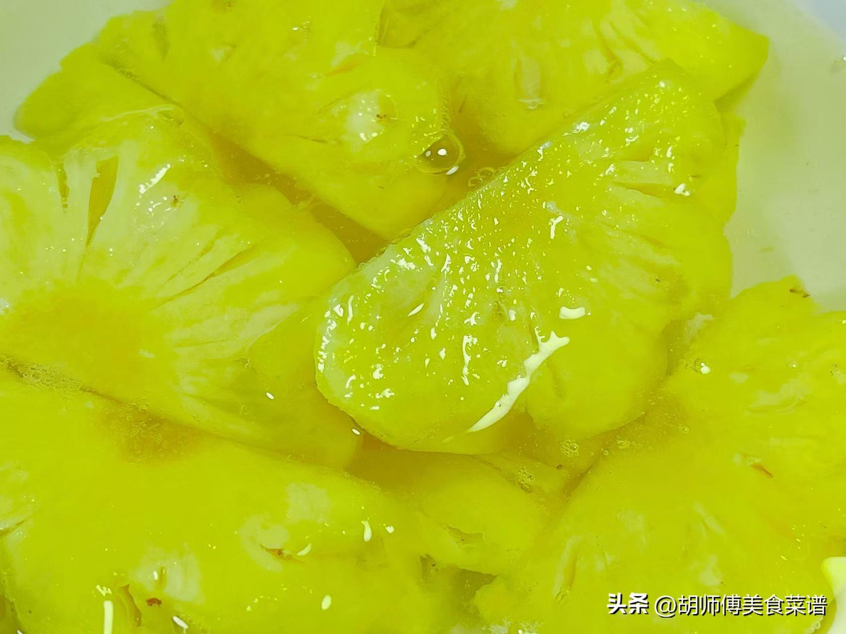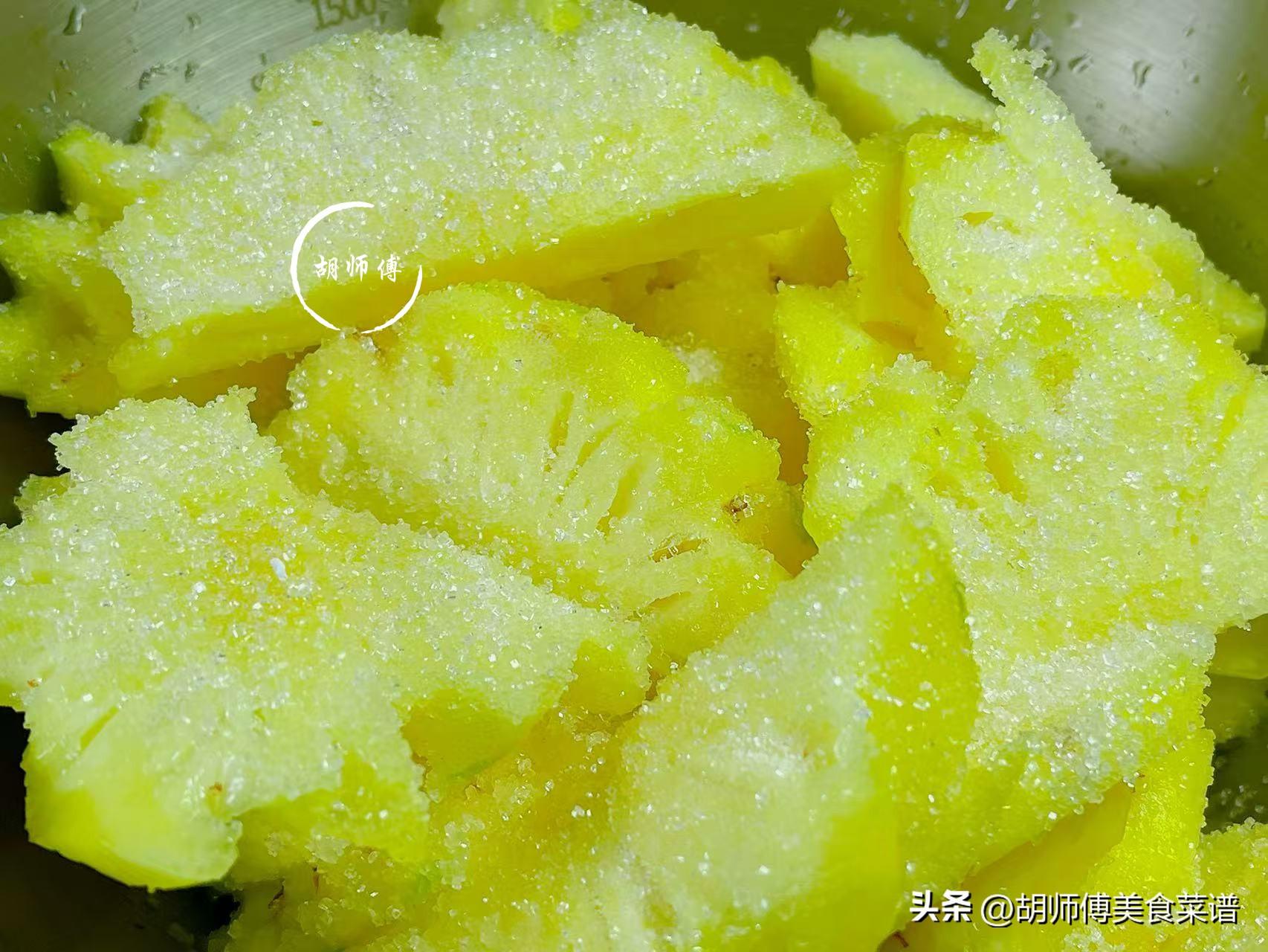第四步:大概將菠蘿醃製2-3小時左右,直到白砂糖全部融化,菠蘿有少許出水,就代表菠蘿醃製好了。