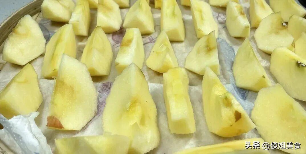 朋友說她家住在頂樓,光照特別好,第一天曬個半天就夠了。曬到啥程度呢?就是蘋果表面摸起來乾乾的,不再黏手,但捏一下里面還是軟軟的。這時候收回來,準備第二蒸。