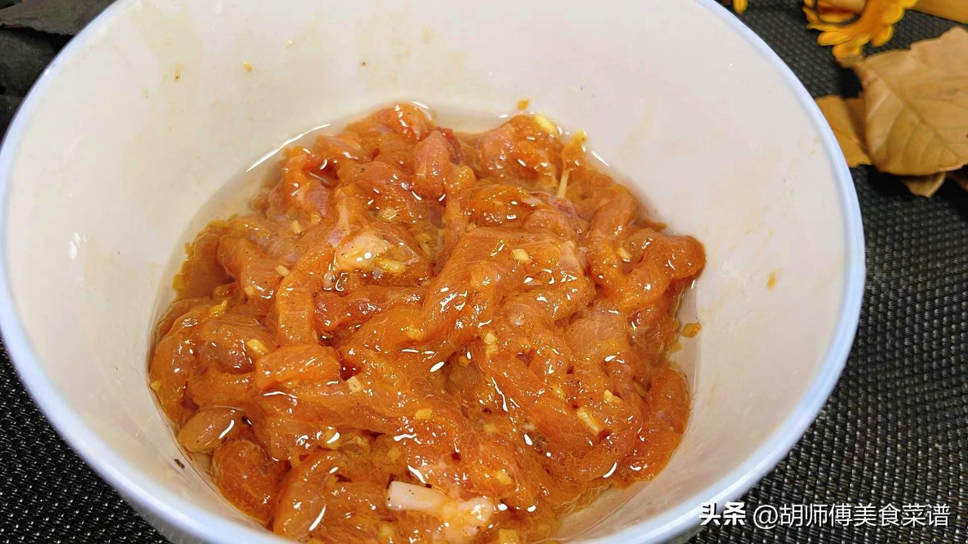 第二步:把瘦肉洗淨後切成細絲,然後將澱粉、生抽、食鹽、雞精、胡椒粉、一小勺水、5ml油放入肉絲中攪拌均勻。