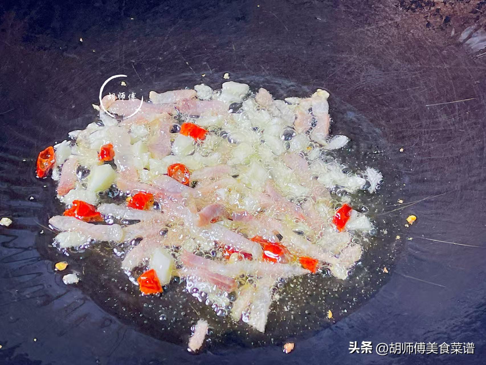 第三步:鍋中放入適量油,等油燒熱後,把臘肉放入鍋中炒香後,然後把幹辣椒、蒜末、幹辣椒放入鍋中爆香。