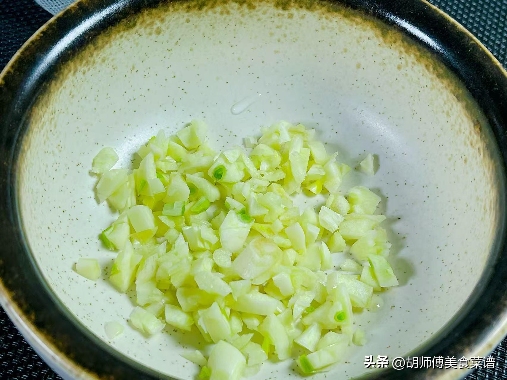 第二步:將大蒜籽沖洗乾淨,然後把大蒜籽切成碎末,大蒜籽一定要多放一點,才能使炒好的蘿蔔苗喫着更香。