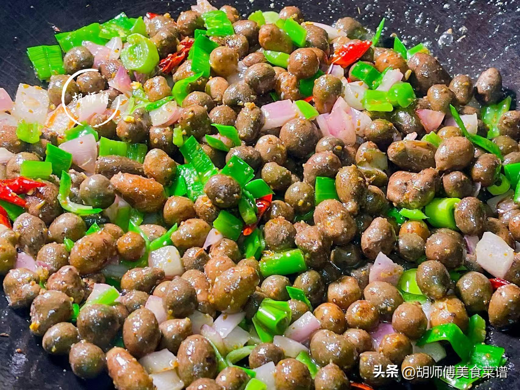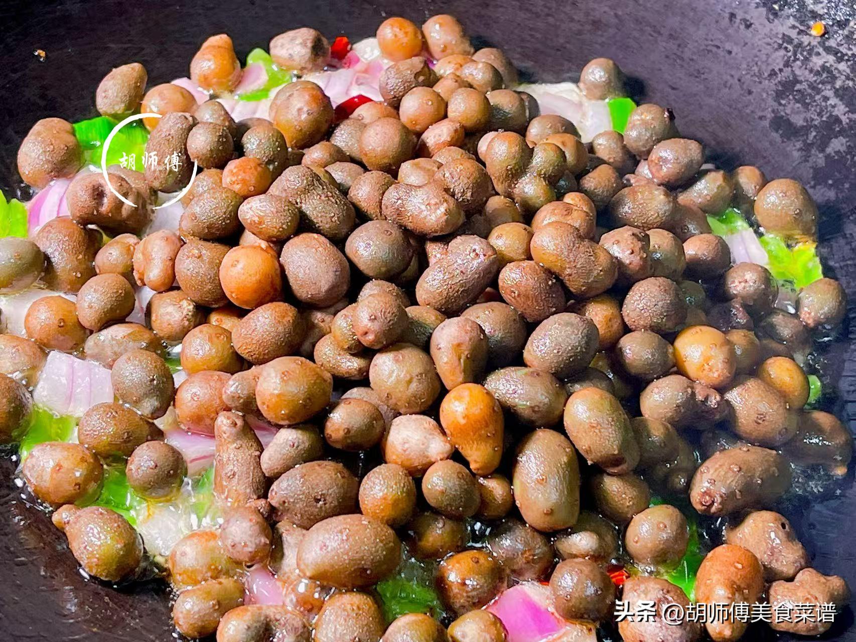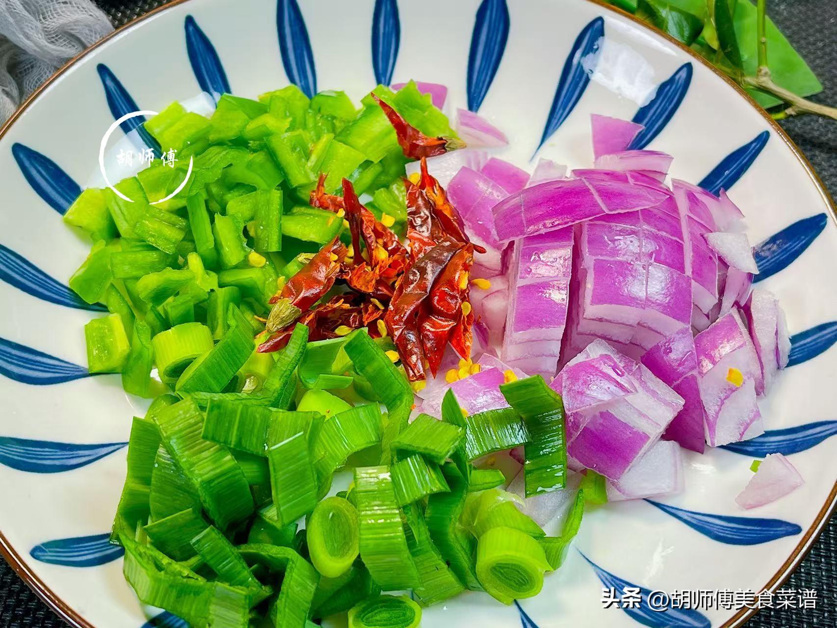 【食材準備】:山藥豆350克、洋蔥20克、青椒20克、大蒜苗30克、幹辣椒、食鹽、雞精、食用油適量。