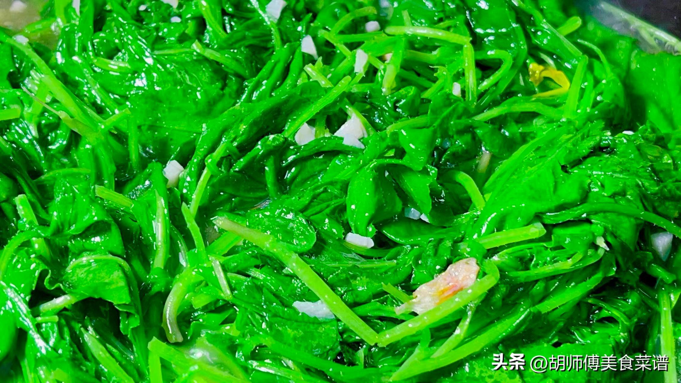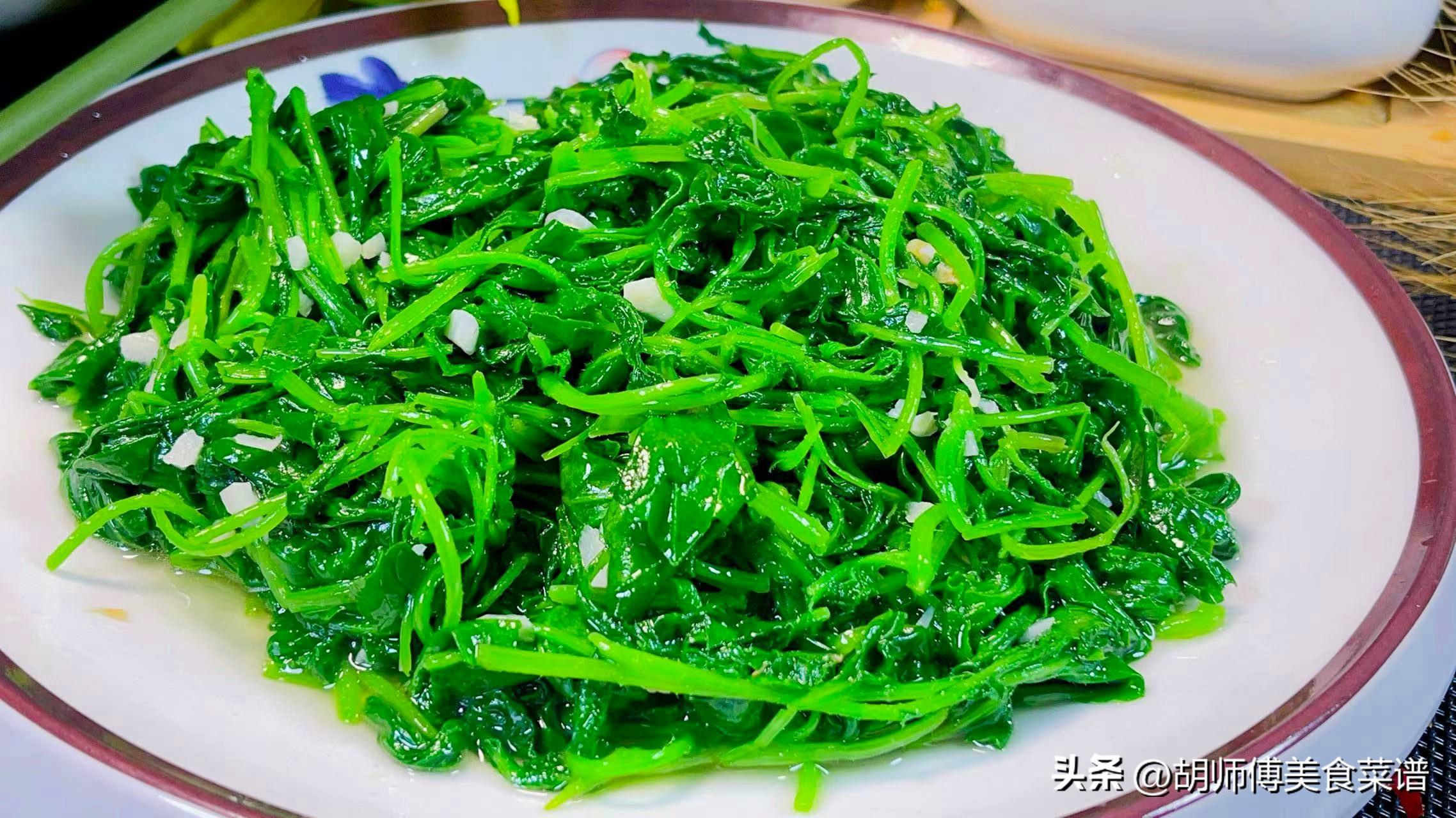 【食材準備】:蘿蔔苗500克、大蒜籽10克、食用油、食鹽、雞精適量。