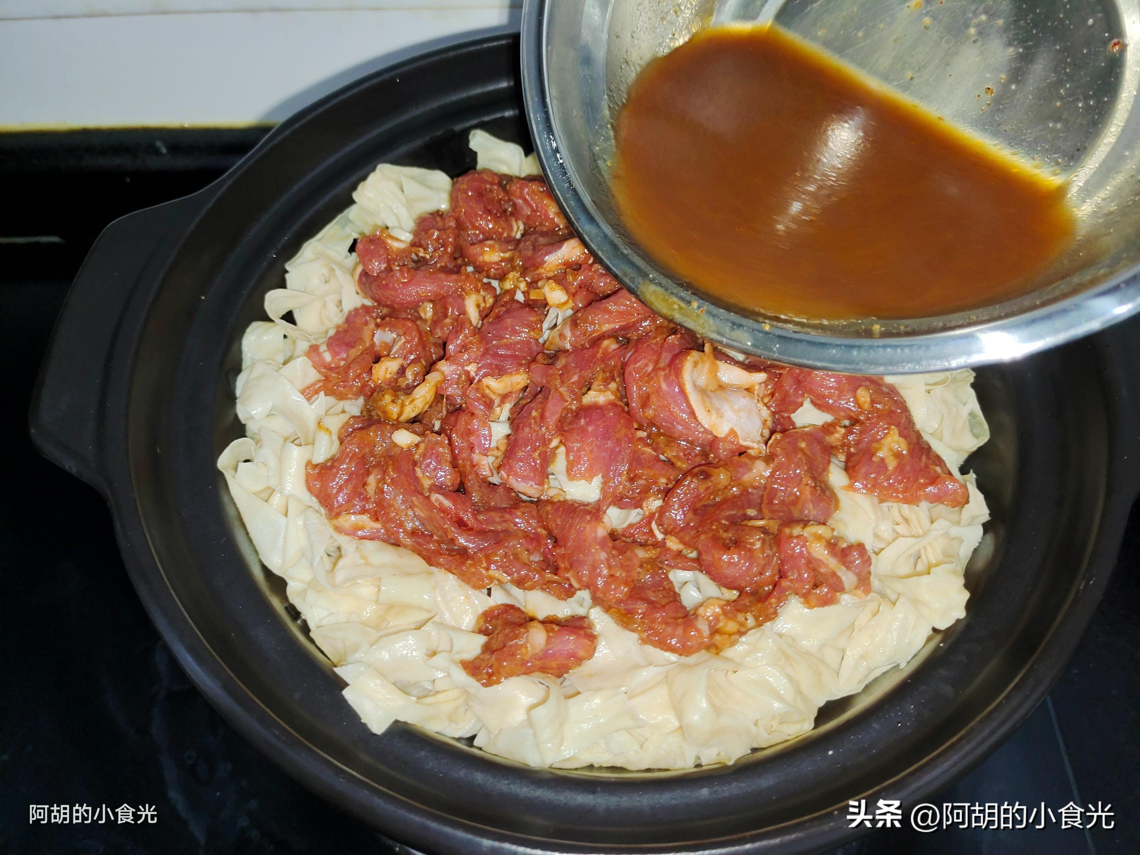 第五步:取出醃製好的牛肉,一片一片地鋪在豆皮絲的上面,整理好後再取出第三步中調好的料汁直接倒入其中,而後蓋好砂鍋蓋子,用中小火燜煮8分鐘左右。注意這道菜中豆皮絲會吸收湯汁,爲了防止燒乾,料汁裏的水量要稍微多一些。