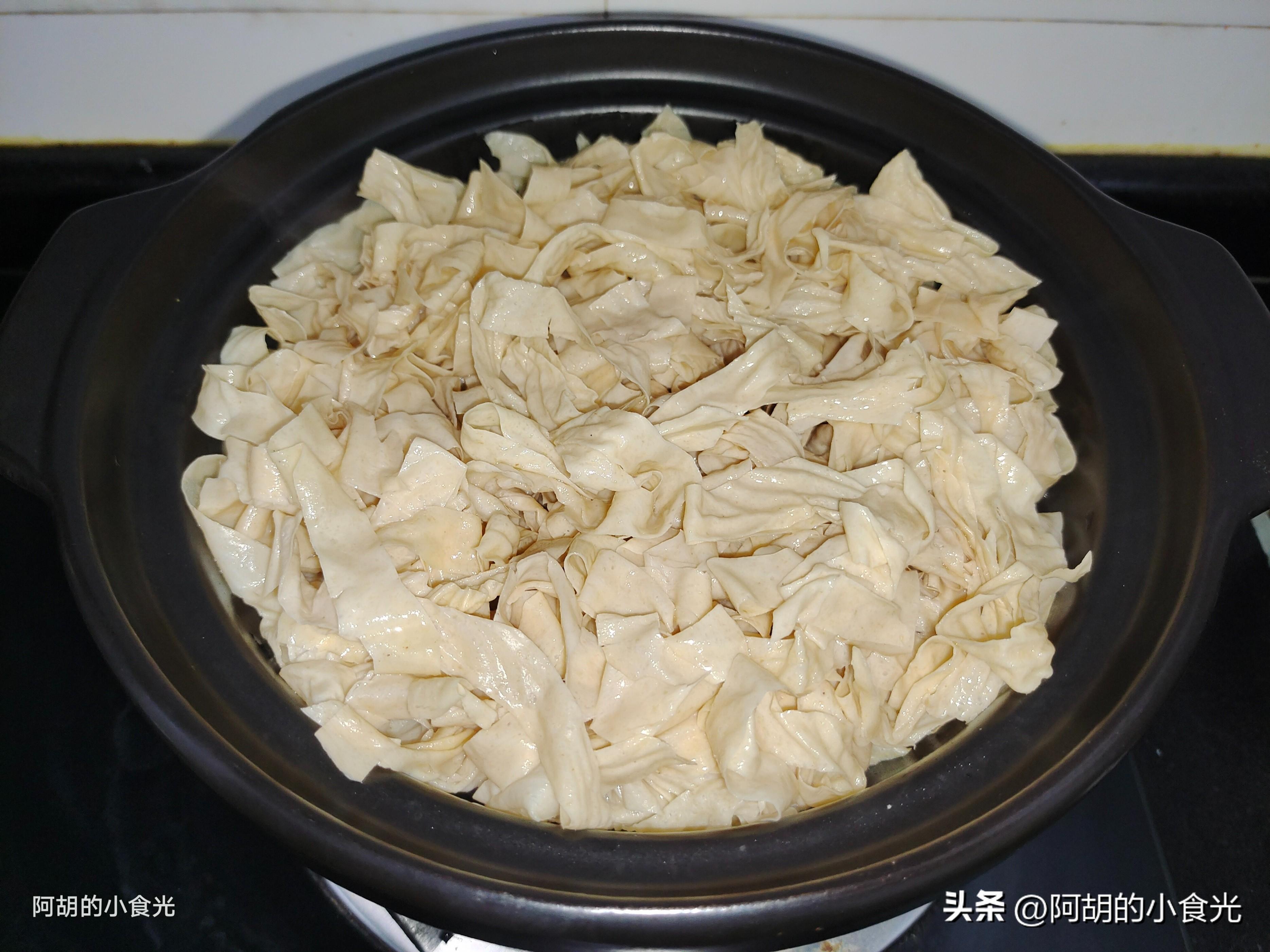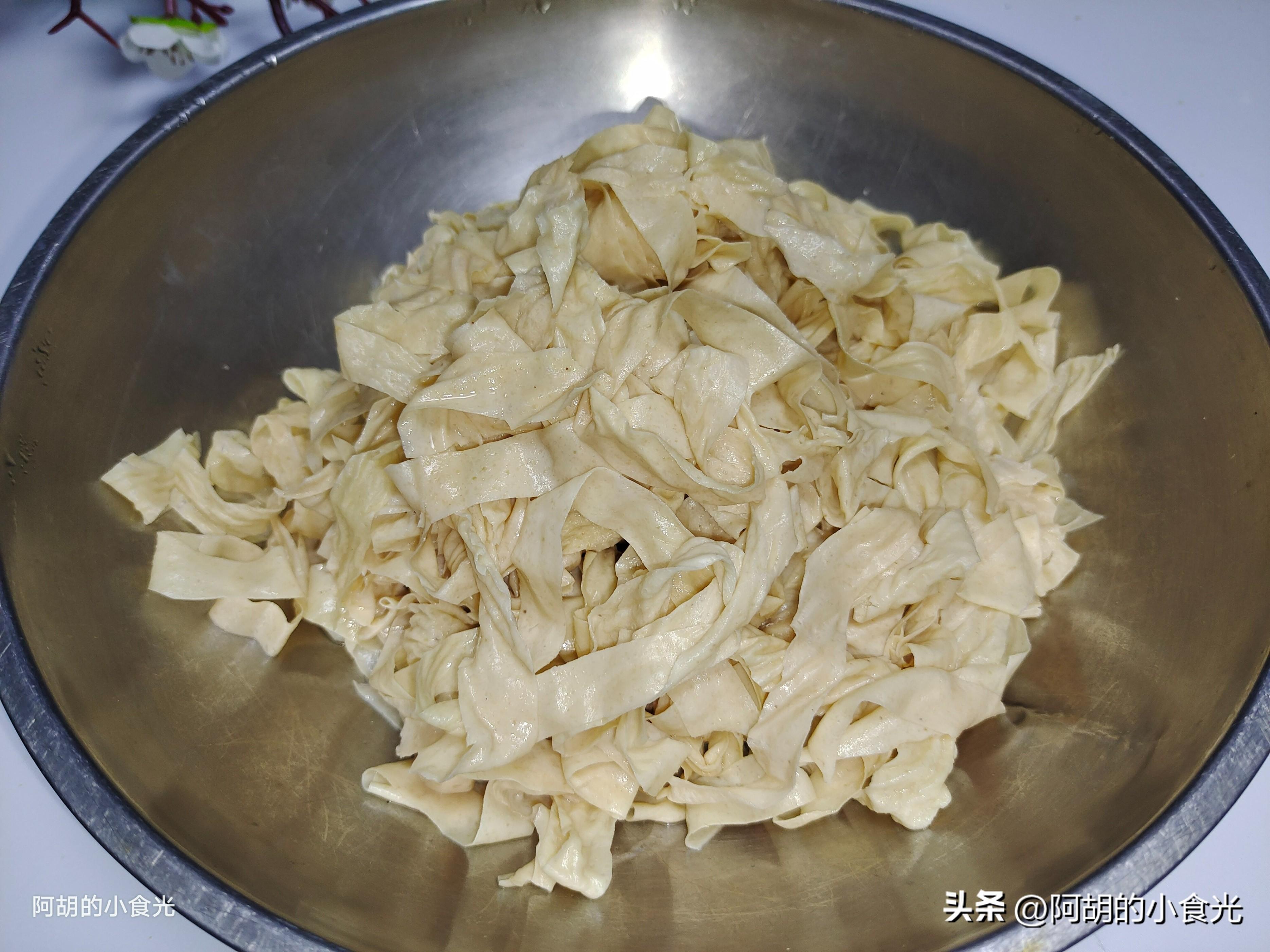 第一步: 先來準備豆皮,我用的就是普通的幹豆皮絲,直接用涼水浸泡半個小時左右,而後再多多地淘洗幾遍擠幹水分待用。也可以用那種大片的豆皮,同樣的泡發淘洗後擠幹水分,再將其簡單切幾刀即可。