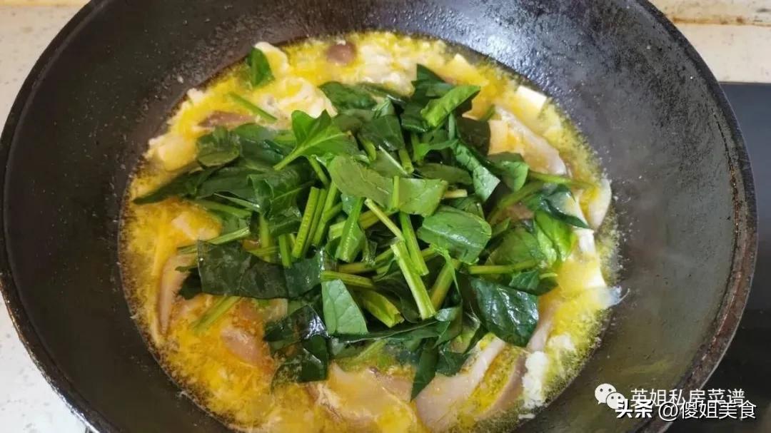 4. 接着放入切好的菠菜段,繼續煮1分鐘,看到菠菜變軟、顏色變得翠綠,就說明煮好了,菠菜煮太久會發黃,口感也會變差,所以時間一定要把控好。