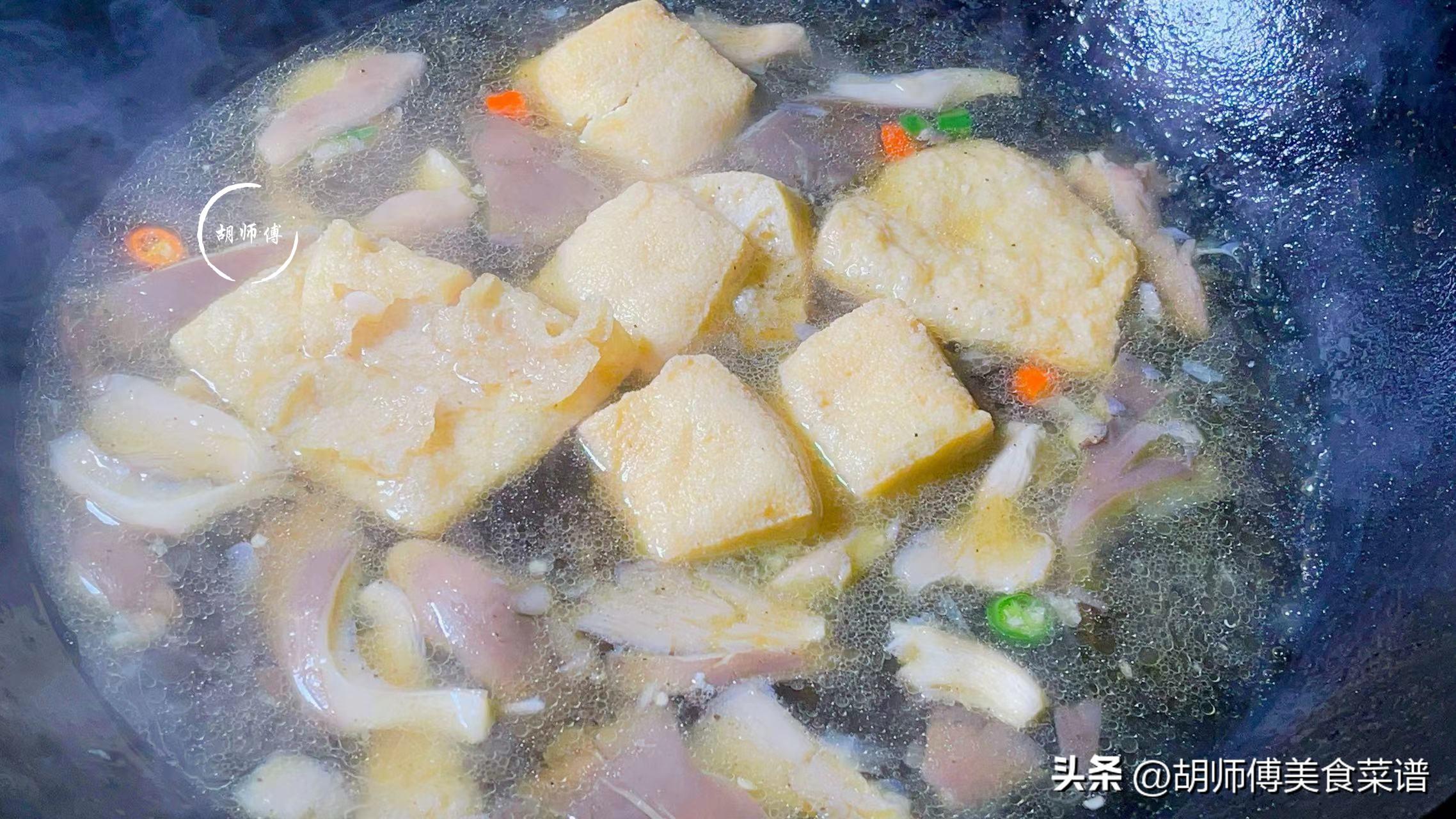 第五步:另起一鍋,將鍋燒熱後,放入一點點油到鍋中,然後把平菇、青紅椒放入鍋中,大火炒半分鐘,放入適量熱水到鍋中,大火煮2分鐘後,將豆泡放入鍋中,繼續煮1分鐘。