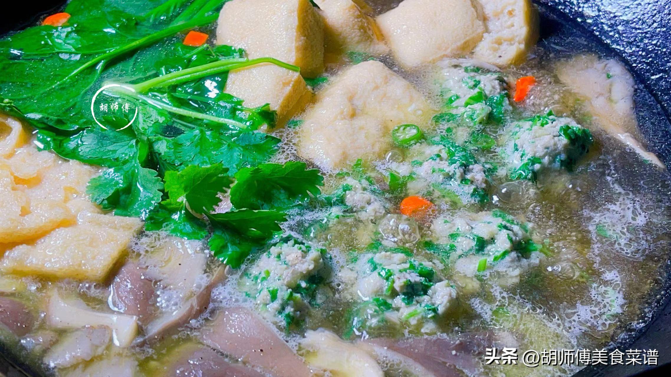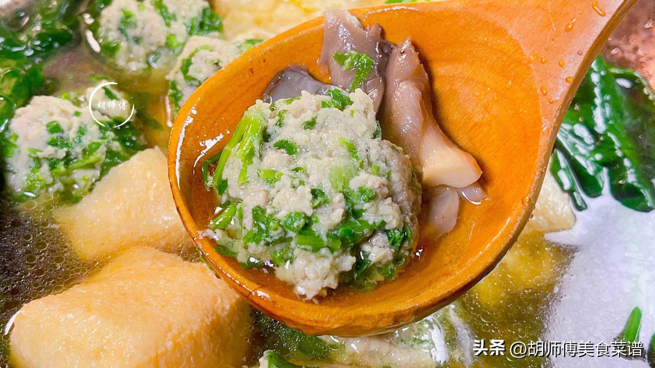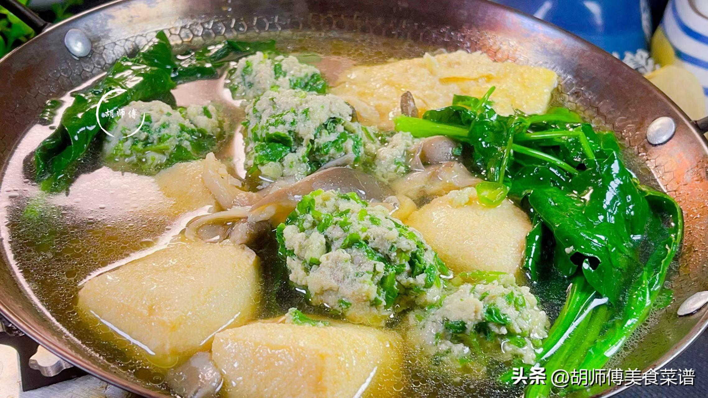 第六步:1分鐘後,將煮好的艾草肉丸、菠菜、食鹽、生抽、胡椒粉都放入鍋中,繼續大火煮2分鐘即可食用。最好的艾草肉丸要趁熱喫,口感是最好的。