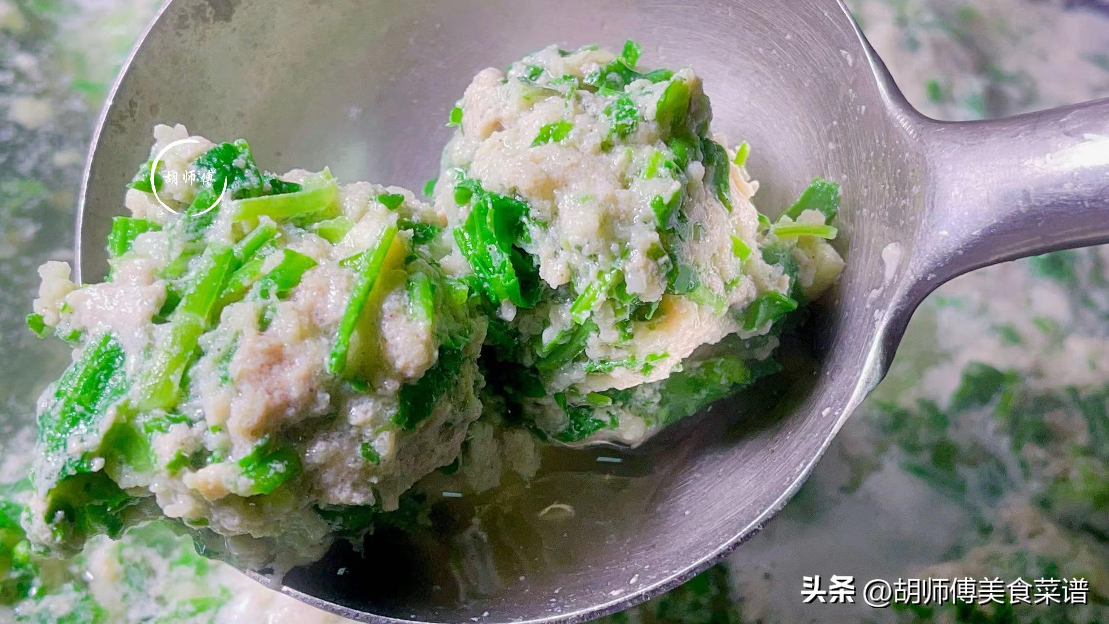 第二步:把肉末、雞蛋、薑末、食鹽、雞精、麪粉、一勺水放入碗中,然後用手一直朝一個方向攪拌,大概攪拌8-10分鐘,直到感覺肉餡很粘連,此時擠一個肉丸放入水中,如果能浮起來,就代表肉丸攪拌好了,如果浮不去起來,繼續朝一個方向攪拌一會,接着再把擠幹水的艾草放入肉末中攪拌均勻即可備用。