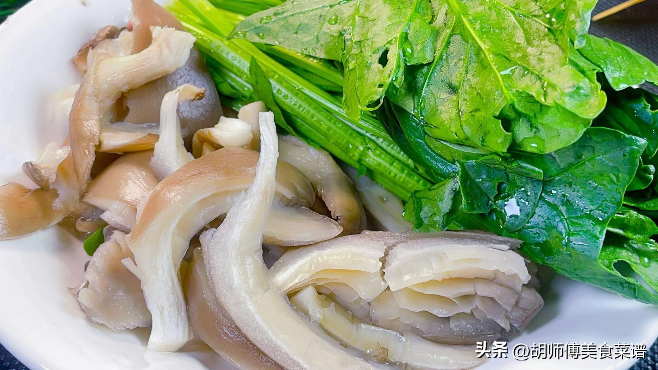 第三步:把菠菜擇洗乾淨,然後把平菇撕成小片後沖洗乾淨,接着再把豆泡對半切開備用。