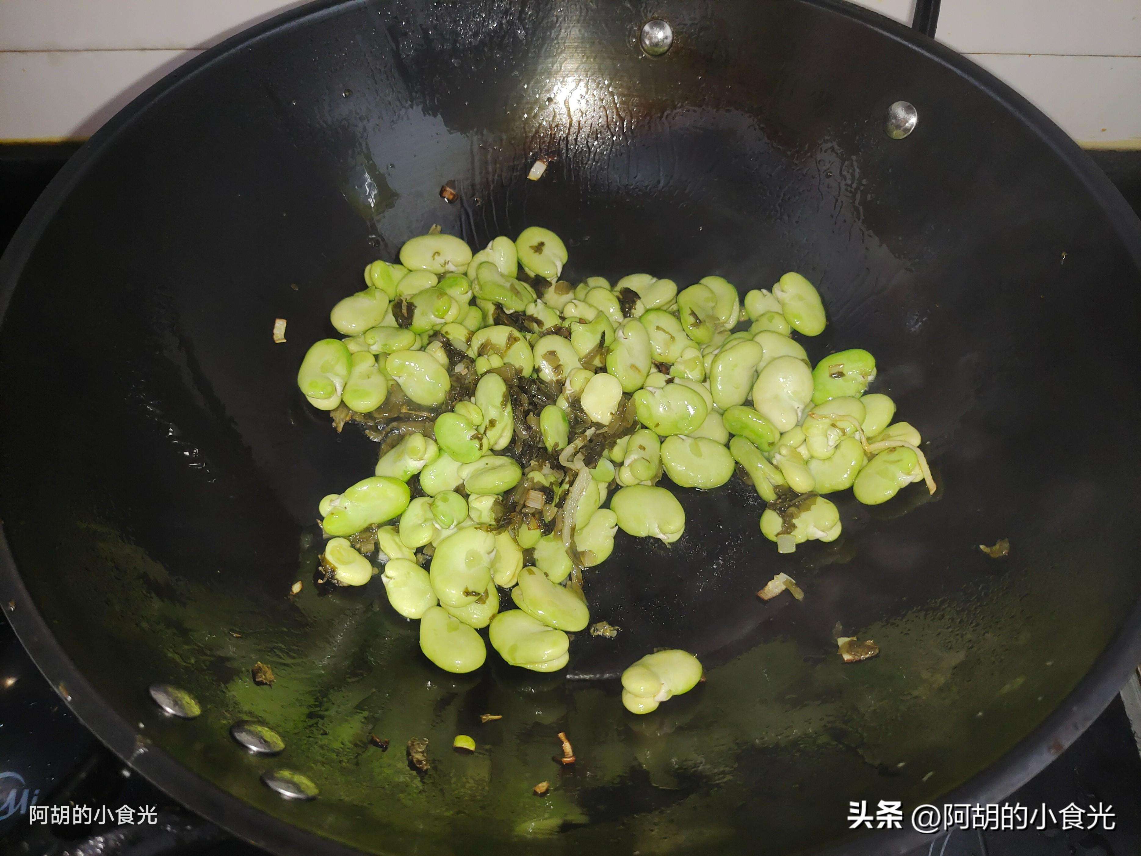 第三步:主要的食材都備好後就可以開火烹飪了。鍋烘乾後淋入一些食用油燒熱,而後加入一些蔥蒜末炒出香味,接着把雪菜先倒入鍋中,簡單炒一炒,而後再把蠶豆仁也倒入鍋中,轉爲大火快速翻炒出食材的香味。