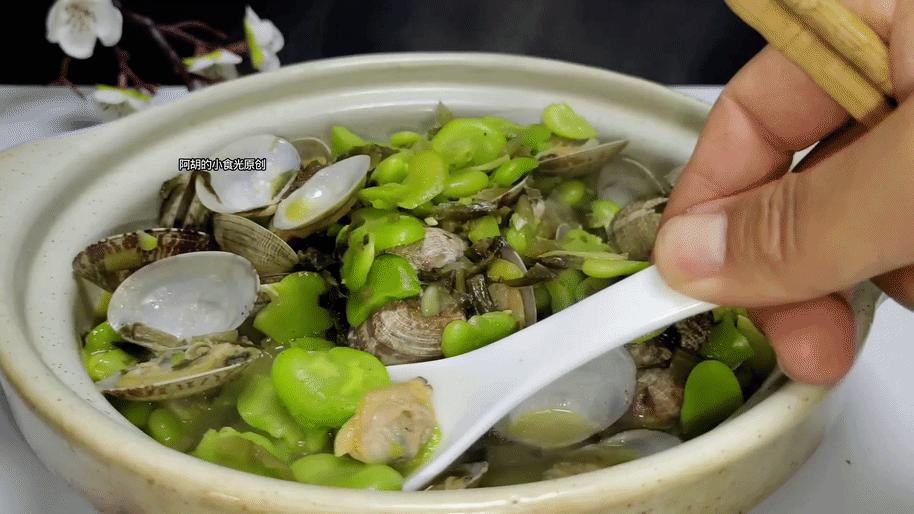 食材很簡單,就三種食材,花蛤、鮮蠶豆和雪菜,在春天這三樣食材是絕對的絕配,蠶豆剛上市紀要抓緊喫,畢竟過了這個季節就沒有了,不但味道鮮美而且營養豐富,有天然補腦豆的稱號,搭配雪菜和小海鮮這麼炒一炒再煮一煮,鮮爽開胃連湯也不能錯過。