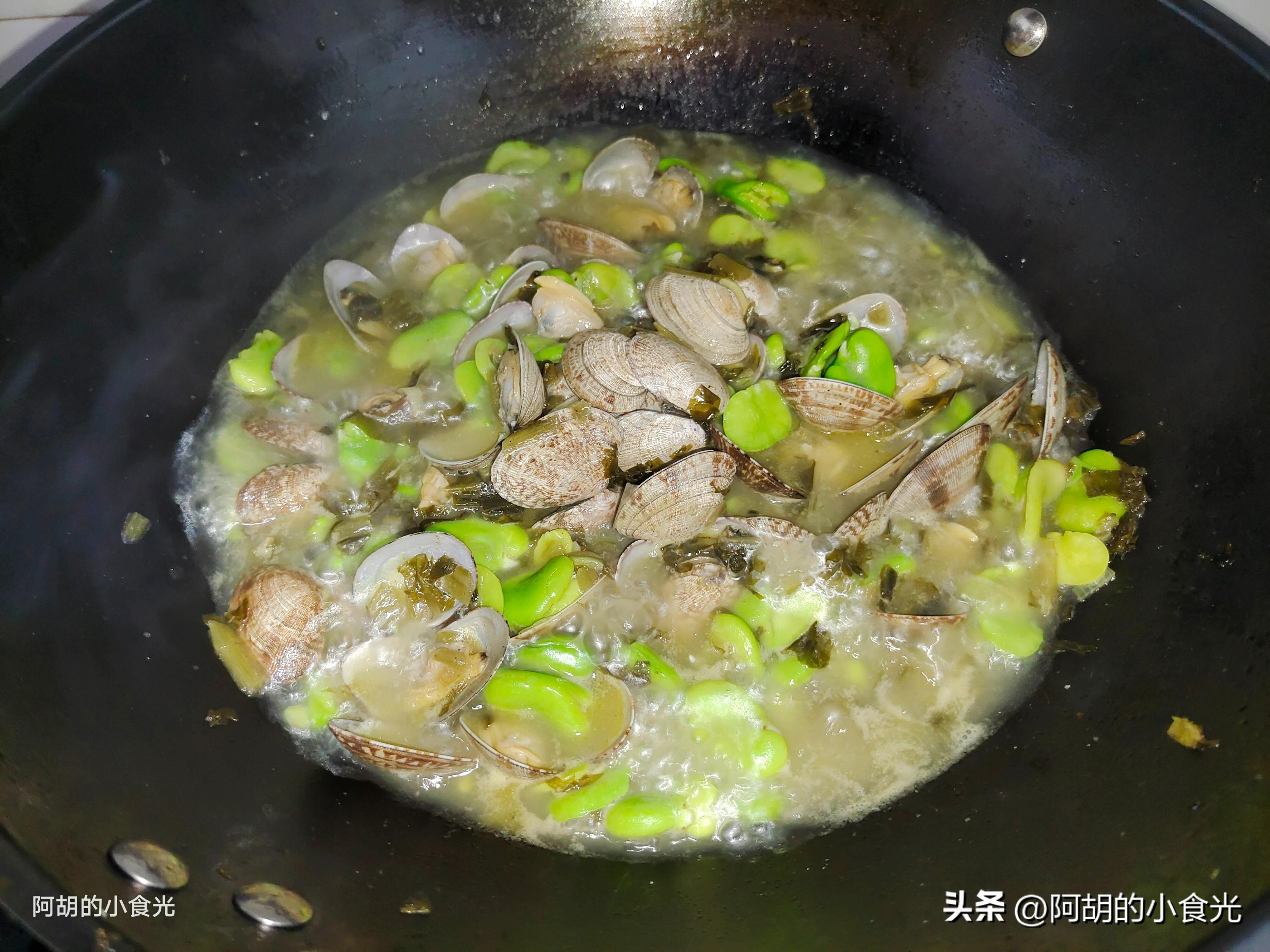 你也可以選擇把花蛤肉挑出來,而後再來和蠶豆、雪菜一塊燒一燒,還是那個重點,煮花蛤的原湯一定不要浪費,絕對是這道菜的鮮味靈魂。