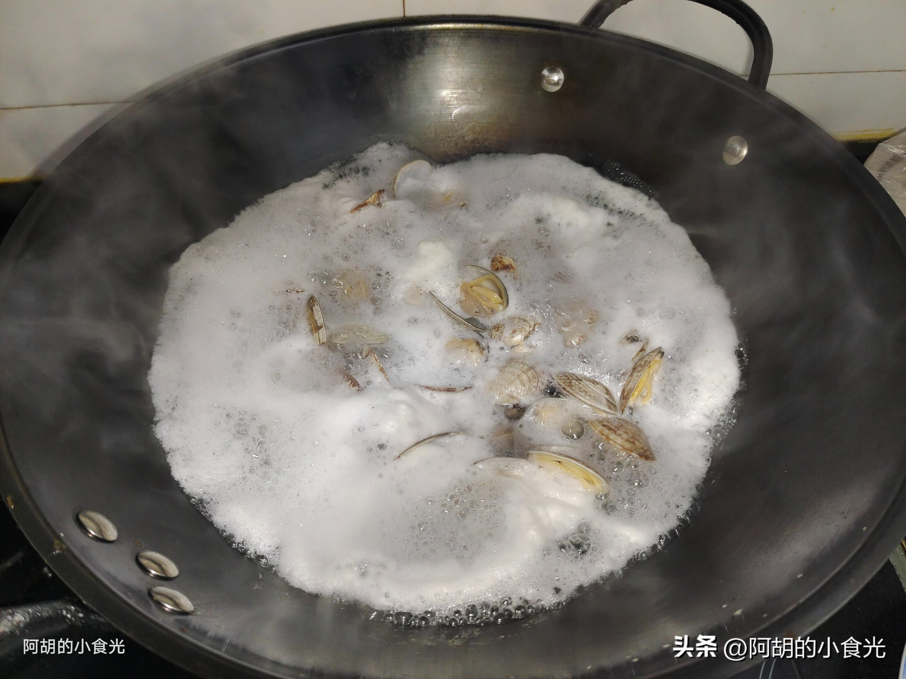 第二步:準備一些鮮活花蛤,買回家後加入一些食鹽和少許的食用油攪拌好,置於安靜一些地方吐吐泥沙。而後再用流水多多地衝洗乾淨,直至水底無泥沙沉澱即可。爲了進一步減少泥沙,這裏再進行一次焯水,直接把花蛤加入涼水鍋中,大火煮至其完全開殼後就撈出,把開殼的花蛤用溫水沖洗幾遍,以減少一些泥沙。而後剩下的花蛤湯也不要浪費,將其倒出後置於一邊靜置沉澱一下備用。