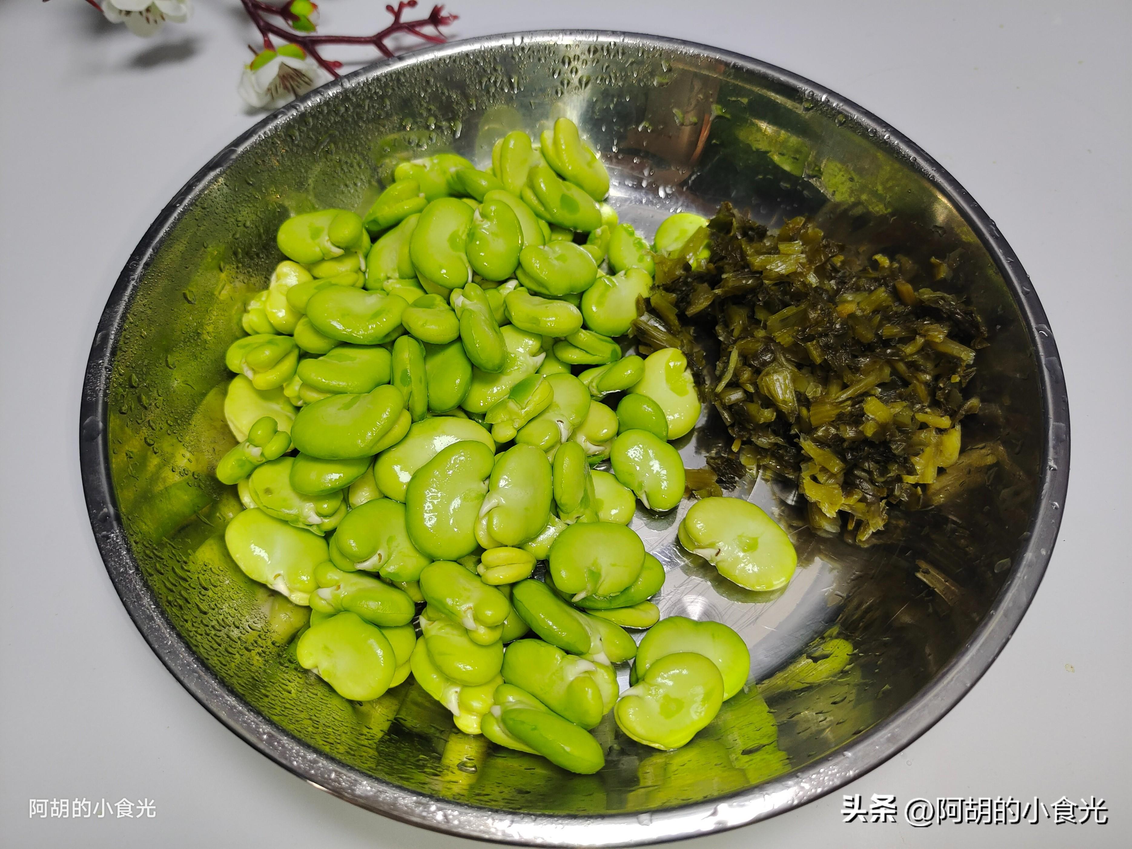 第一步:先來準備鮮蠶豆,去殼後把蠶豆仁的外皮也一塊去掉,這樣更有利於蠶豆鮮味的釋放,淘洗乾淨後瀝乾水分備用。而後準備一些醃製的雪菜,用清水洗掉一些鹽分後擠幹水分後切碎待用。