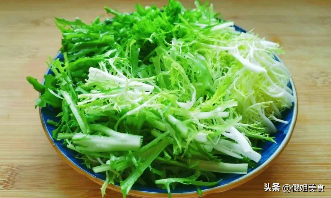 泡好後撈出來,用清水再衝一遍,然後徹底瀝乾水分!這步超重要,水分太多拌出來的菜會發蔫,口感大打折扣。最後把瀝乾的苦菊切成5cm左右的段,方便夾着喫,切好放進大碗裏備用。