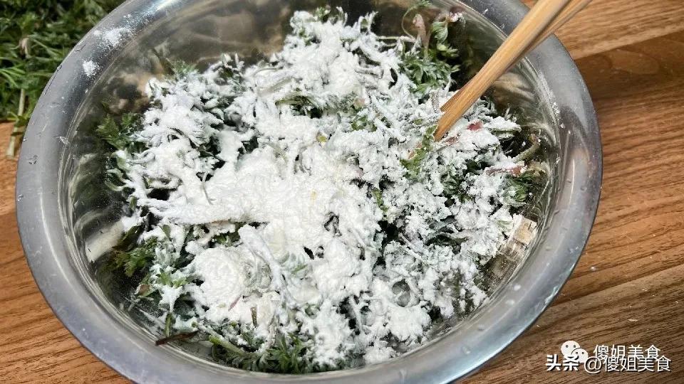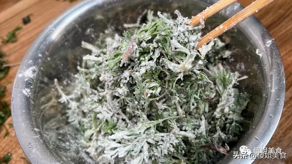 第二步:拌麪粉接下來就是拌麪粉了,咱用普通的小麥粉就行,喜歡粗糧口感的,可以加1/3的玉米麪,更香。分次往盆裏加麪粉,一邊加一邊用手翻拌,讓每一片白蒿葉子都均勻地裹上一層薄薄的麪粉,就像給葉子穿了一層白紗一樣,不要裹太厚,太厚就成麪糰了,失去了野菜的鮮味兒。最後撒上一小勺鹽,翻拌均勻,給白蒿入個底味。
