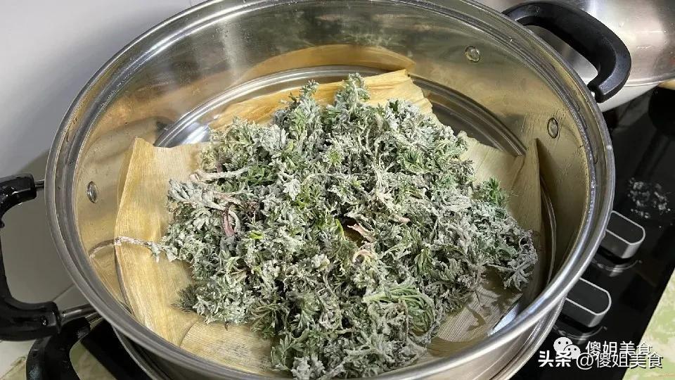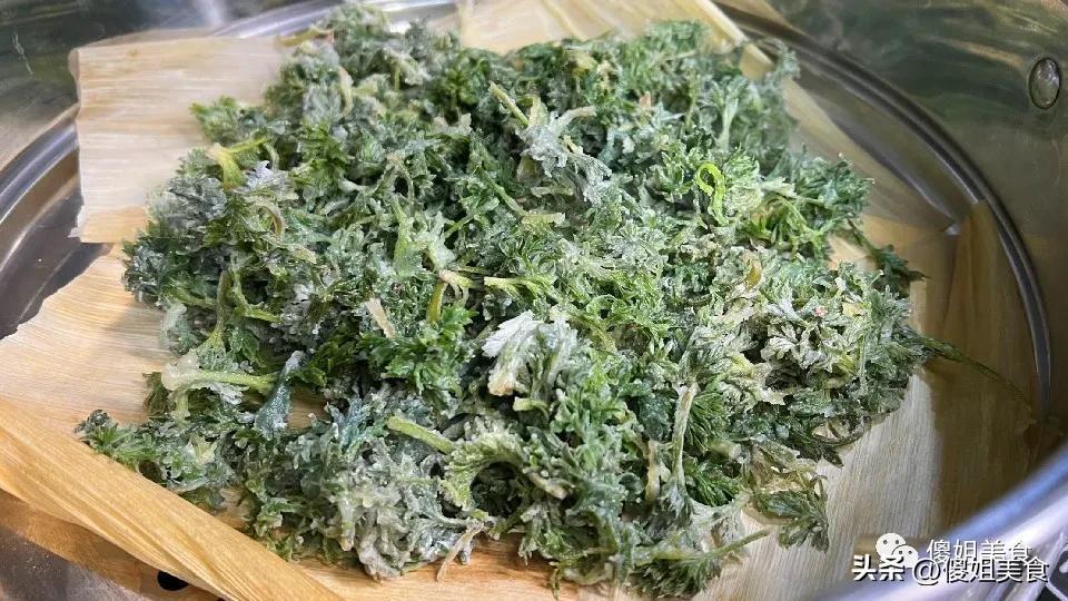 第三步:上鍋蒸蒸鍋里加水燒開,籠屜上鋪上籠布(我家常鋪玉米皮,蒸出來有股淡淡的玉米香,姐妹們也可以用蒸籠紙),把拌好麪粉的白蒿鬆散地鋪在籠布上,不要壓實,鋪得越鬆散,蒸出來越好喫。水開後上鍋,大火蒸5-8分鐘就夠了!千萬不要蒸太久,時間一長,白蒿就發黃、發黏,口感就差了,嫩苗蒸5分鐘剛好,葉子翠綠,口感鮮嫩。