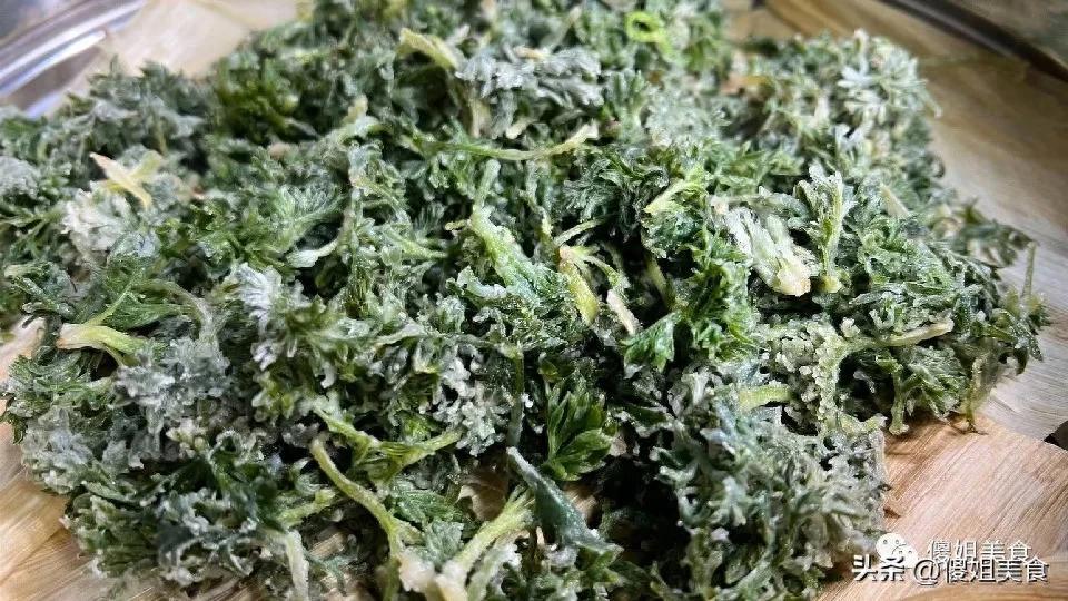 選菜小技巧1. 一定要挑嫩苗!只掐頂端的嫩芽,老杆子、硬葉子都不要,不然蒸出來發柴,影響口感。2. 白蒿葉子上的白絨毛是新鮮的標誌,絨毛越密、越白,說明越嫩。3. 採回來的白蒿先挑一遍,把雜草、爛葉子都摘乾淨,再用清水多淘洗幾遍,把泥沙衝乾淨,然後放在篩子裏瀝乾水分,這一步很重要,水分太多蒸出來會坨成一團。