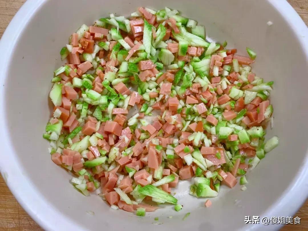 把切好的火腿丁和西葫蘆丁放進碗裏,加一點點鹽(火腿本身有鹹味,鹽一定要少放!),再撒一點點十三香提味,攪拌均勻,內餡就做好了。加西葫蘆是爲了解膩,喫起來更清爽,孩子也不會覺得膩,不愛喫菜的小朋友也能悄悄補營養。