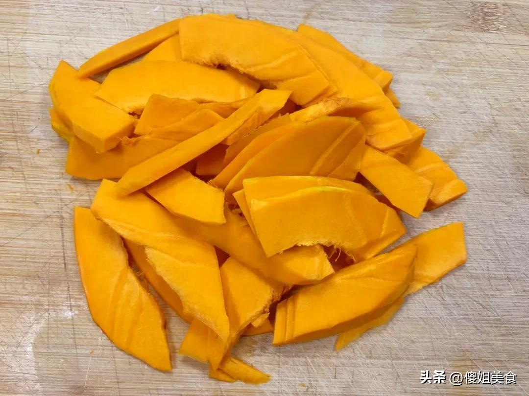 先把買回來的南瓜洗乾淨,用刀去皮、挖掉中間的瓜瓤和籽,然後切成薄片。切得越薄,蒸的時候就越容易爛,節省時間。