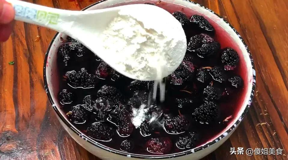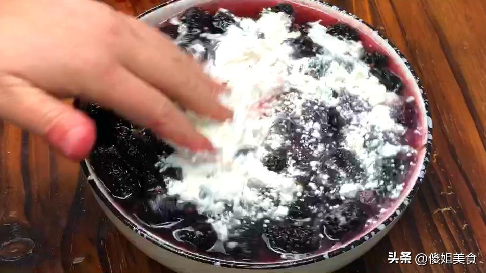 重點來了!往水裏加一勺普通的麪粉,就是咱家裏蒸饅頭、包餃子用的白麪就行,不用加別的。加完麪粉之後,用手輕輕攪拌一下,讓麪粉充分溶解在水裏,變成淡淡的麪湯。記住,攪拌的時候一定要輕,別使勁搓桑葚,就順着一個方向輕輕攪幾下,讓麪湯裹住每一顆桑葚就行。