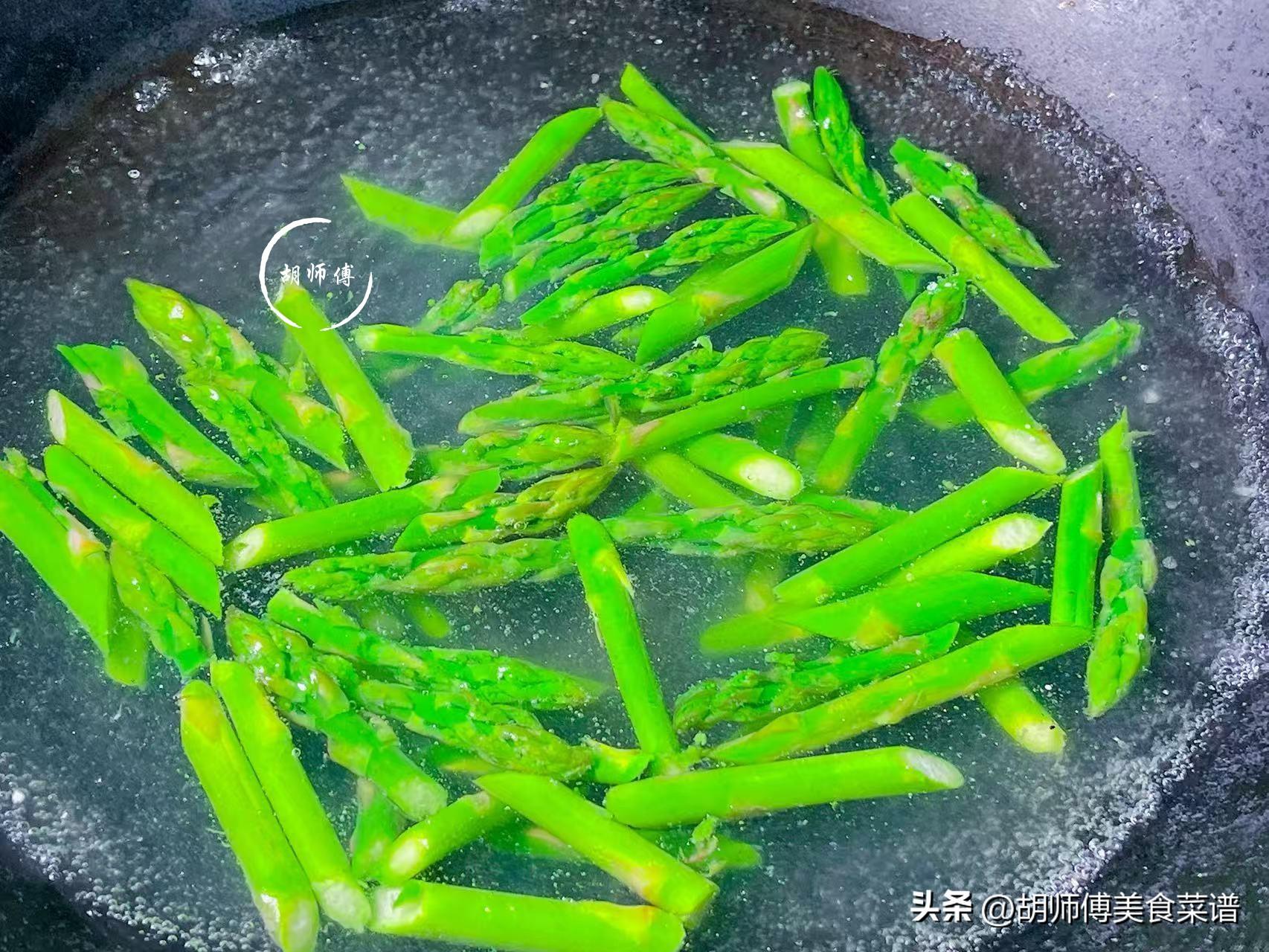 2、焯水後的蘆筍,已經接近8-9成熟,所以再炒蘆筍時,時間不要太久,把炒的時間控制在半分鐘左右最好,炒久了,蘆筍反而喫着不脆了。