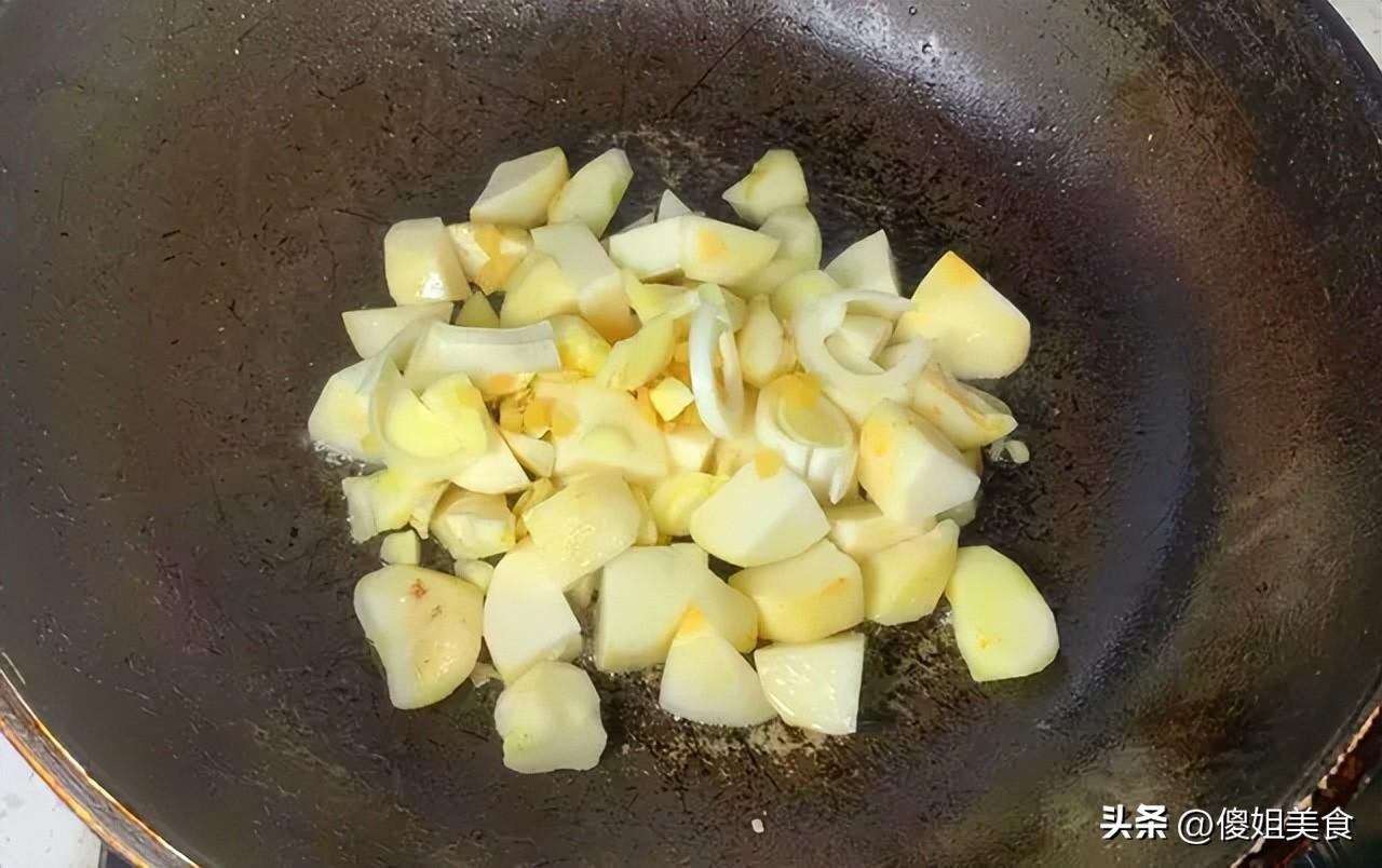 第三步:大火快炒,香飄滿屋1. 起鍋燒油,油熱後放入蔥薑蒜爆香,炒出香味就行,別炒糊了,糊了就發苦了。2. 先把芋頭塊下鍋,大火翻炒1分鐘,讓芋頭表面微微焦黃,這樣喫着更香,還能鎖住芋頭的水分,保持軟糯。