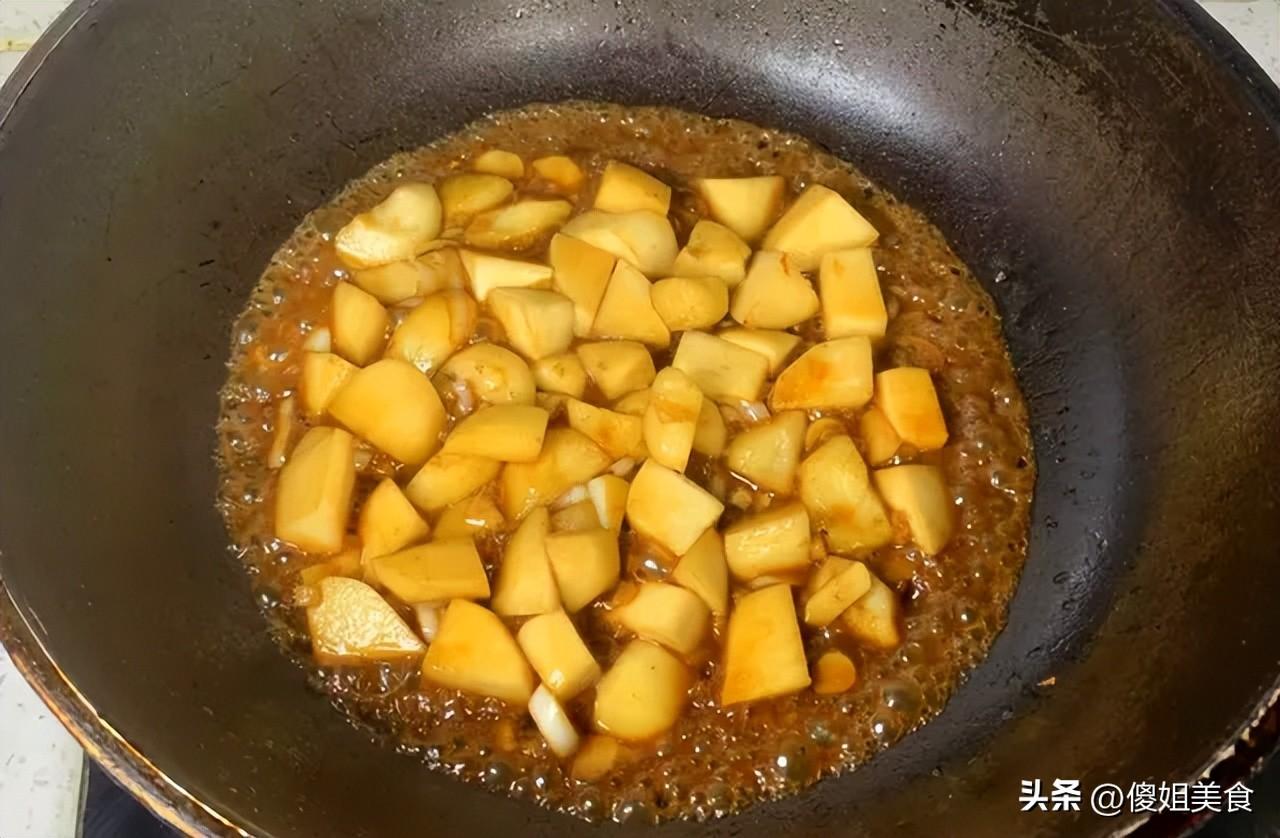 3. 接着把馬蹄塊下鍋,跟芋頭一起大火翻炒30秒,馬蹄很容易熟,別炒太久,不然就不脆了。4. 把調好的醬汁倒進鍋裏,翻炒均勻,讓每一塊芋頭和馬蹄都裹上醬汁。然後轉中小火,燜煮2分鐘,讓芋頭充分吸收醬汁的香味,馬蹄也能入味。5. 最後開大火收汁,收到醬汁濃稠,緊緊裹在食材上,撒上一把蔥花,翻炒兩下,就可以出鍋啦!