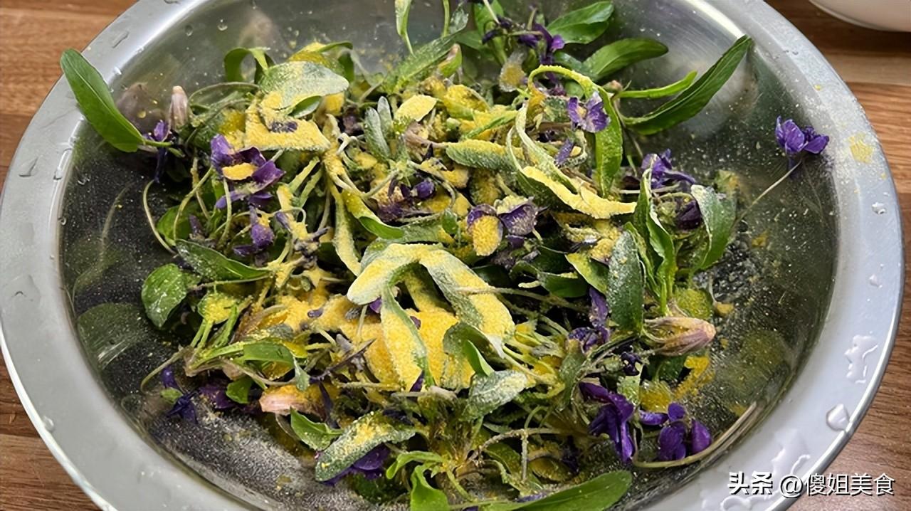這道清蒸紫花地丁,喫起來帶着玉米麪的粗糧香,野菜的清鮮裹着蒜香醋香,一點都不膩,配粥、配米飯都絕了,我一頓能炫半盤。